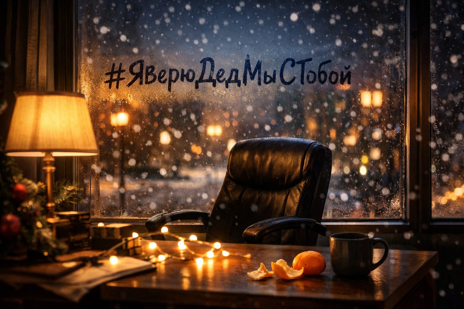 Юрка подошел к окну и что-то написал на стекле. Вглядываясь в написанные буквы, он увидел доброе краснощекое лицо Деда, как бы Мороза. «Настоящий» — подумал Юрка и дописал последнюю букву #ЯверюДедМыСТобой