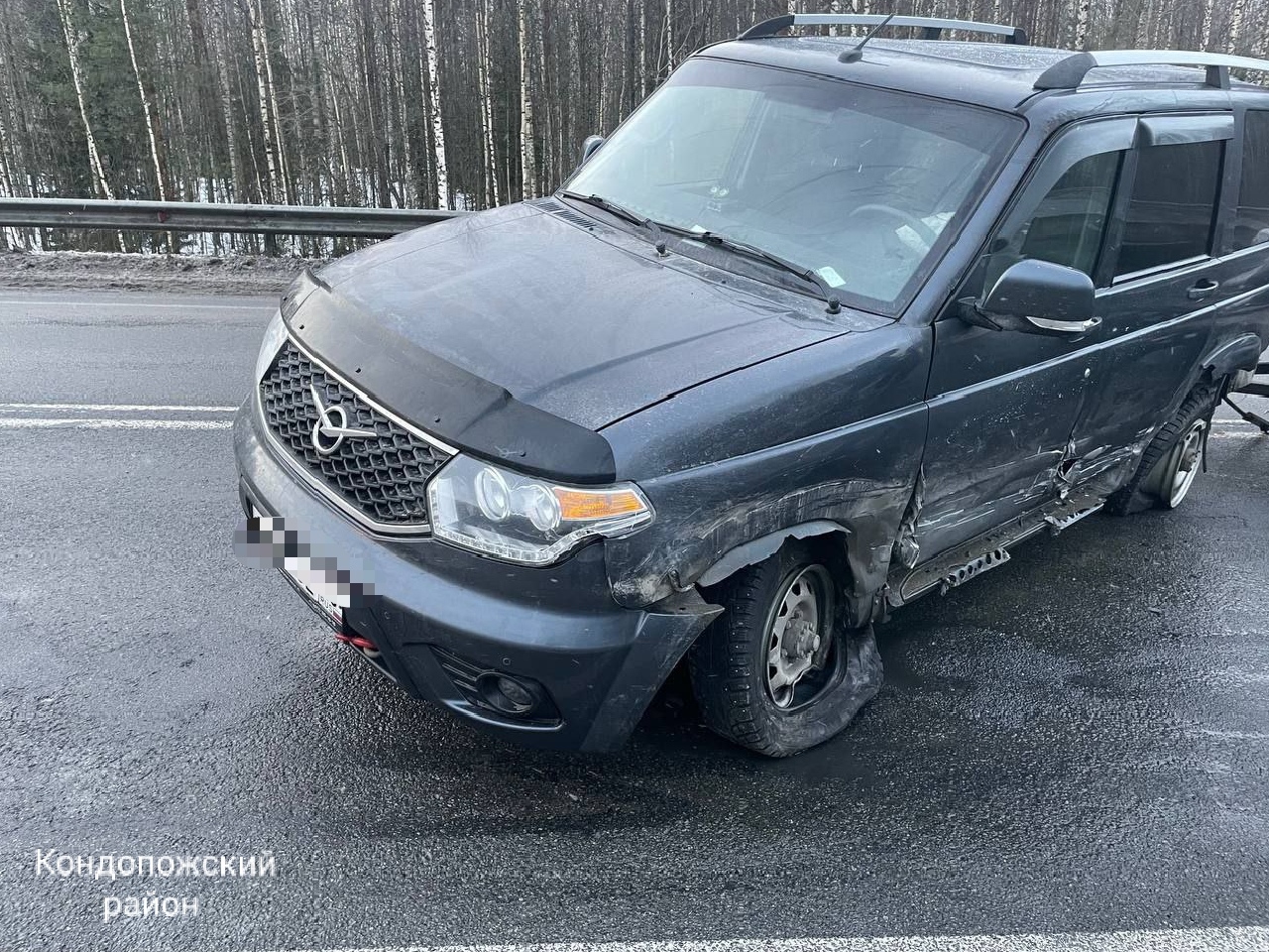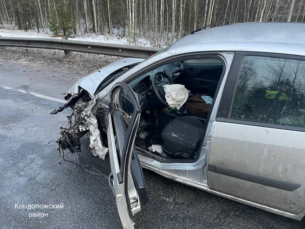 По предварительным данным, водитель автомобиля Ford Fiesta, двигаясь в сторону Медвежьегорска, выехал на полосу встречного движения, где столкнулся с автомобилем УАЗ Патриот с прицепом, после чего наехал на барьерное ограждение.