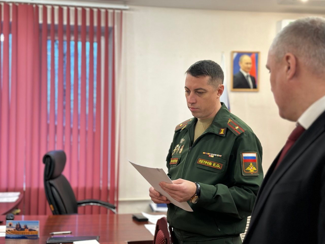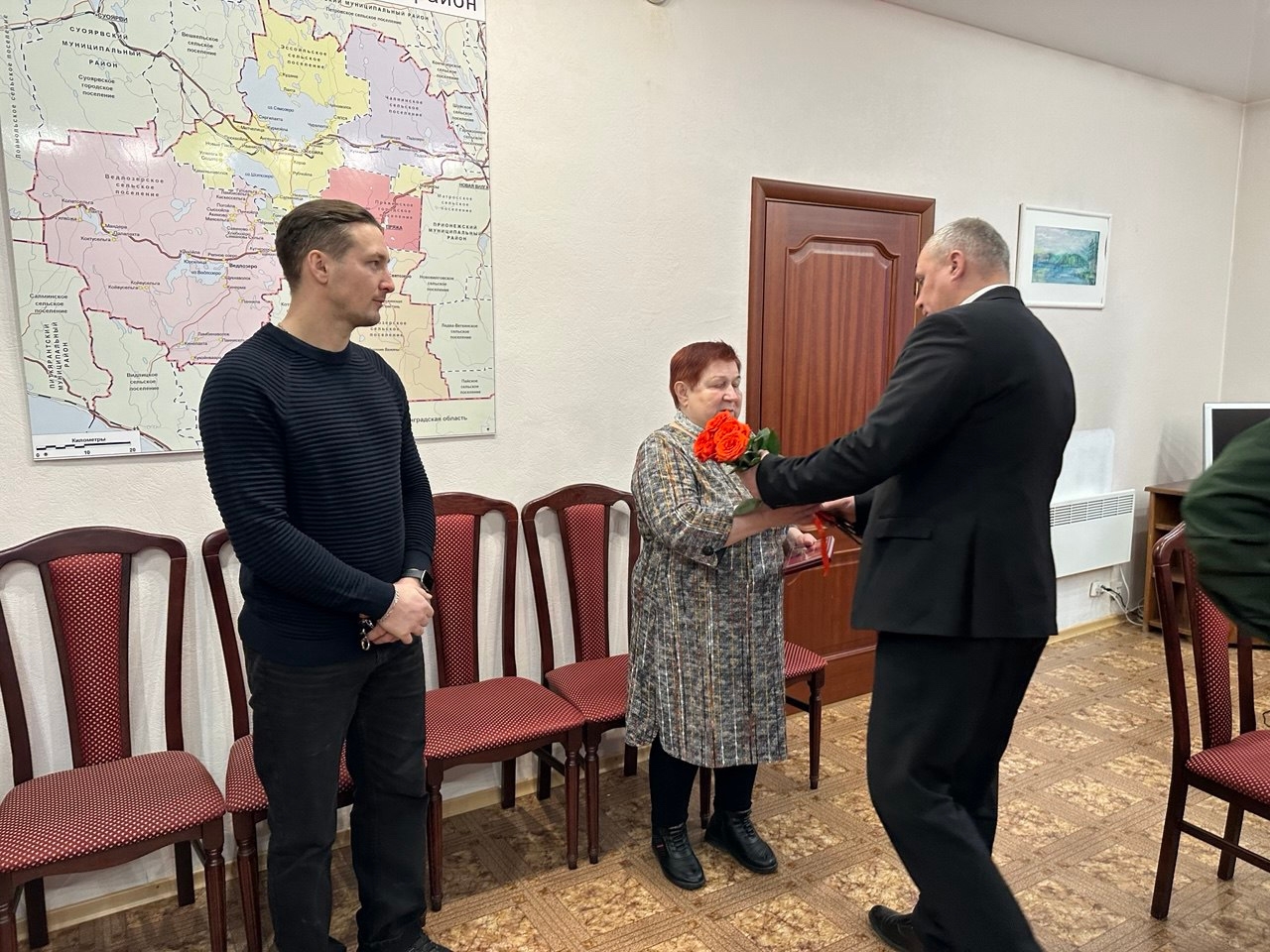 Глава администрации района Дмитрий Буевич совместно с военным комиссаром Евгением Петровым и социальным координатором государственного фонда «Защитники Отечества» Ириной Гречневой вручили государственную награду маме Андрея.