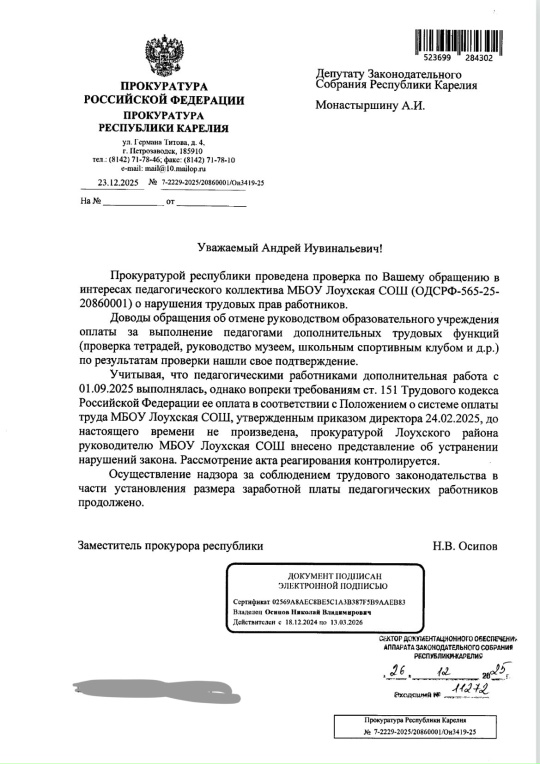 Как сообщил народный избранник, надзорным ведомством проведена проверка по обращению в интересах педагогического коллектива МБОУ «Лоухская СОШ» о нарушении трудовых прав работников.