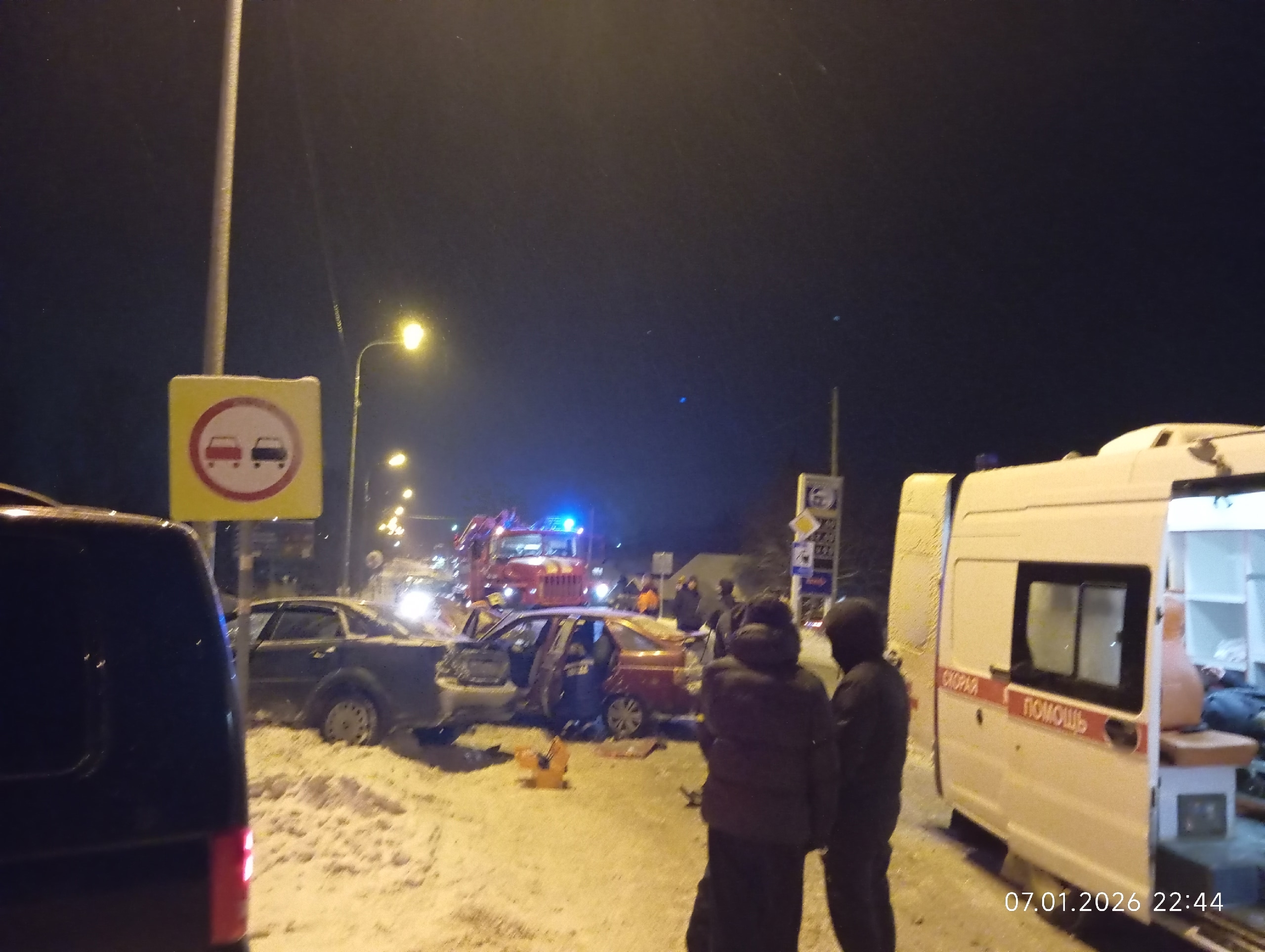 Трое пострадавших были переданы медикам скорой помощи. Предварительная причина ДТП — выезд на полосу встречного движения с нарушением ПДД.
