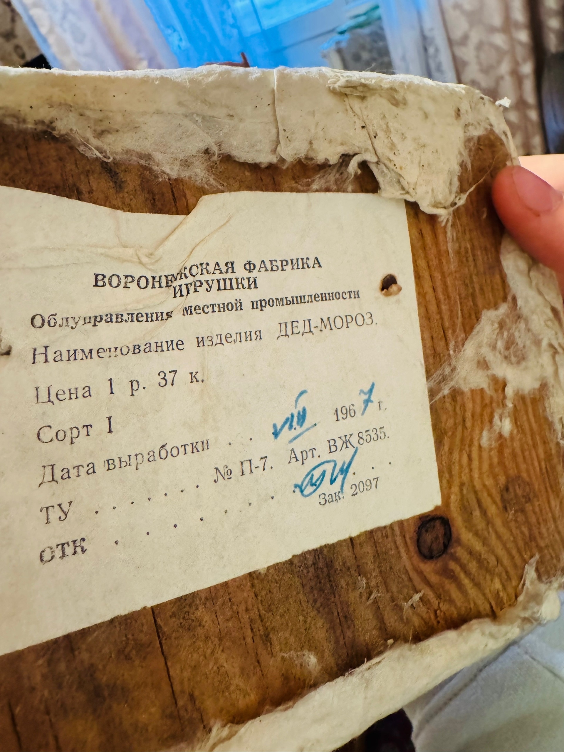Особенно любим в семье Дед Мороз, словно вышедшей из книги русских народных сказок: белый кафтан накинут на красное длинное одеяние с традиционной карельской вышивкой. Хранительница раритетных игрушек вспоминает, что семья приобрела их в далеком 1967 году, о чем свидетельствует и этикетка на деревянном основании Деда Мороза.