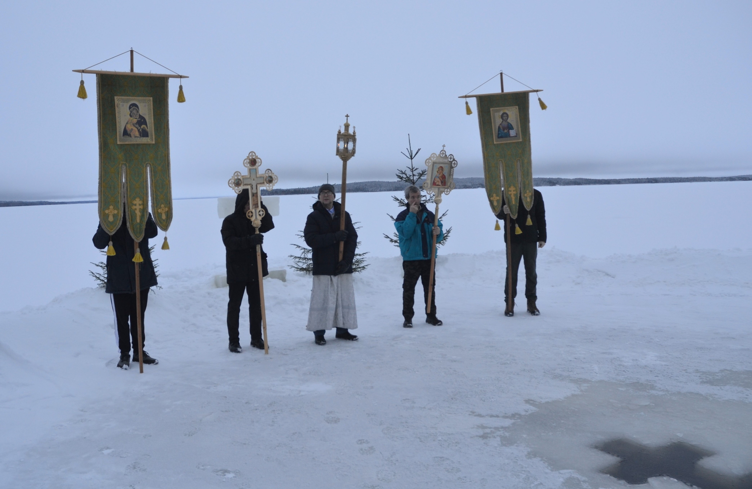 «Освящение воды проходило как в самом храме, так и на озере Куйтто. С крестным ходом прихожане и жители поселка направились к Иордани – специально выпиленной во льду водоема проруби в форме креста. Несмотря на то, что традиционных купаний, как и в прошлые годы, не проводилось, это не умалило торжественности момента. Люди собрались, чтобы стать свидетелями и участниками древнего обряда, символизирующего очищение и обновление. Безопасность мероприятия была обеспечена на высшем уровне. На льду озера дежурили сотрудники Отделения полиции и ГИМС, гарантируя спокойствие и порядок во время проведения освящения», — написали авторы поста.