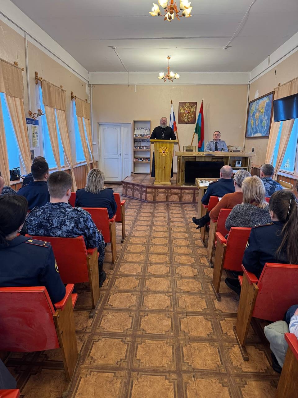 Литургию и молебен провёл помощник по работе с верующими протоиерей Леонид Леонтюк. Он обратился к осуждённым с проповедью, призвав их к раскаянию и использованию времени заключения для духовного перерождения. В ИК-1 также прошла исповедь, которую провёл священник Игорь Егоров. После службы отец Леонид встретился с сотрудниками учреждения и прочитал лекцию о церковных праздниках.