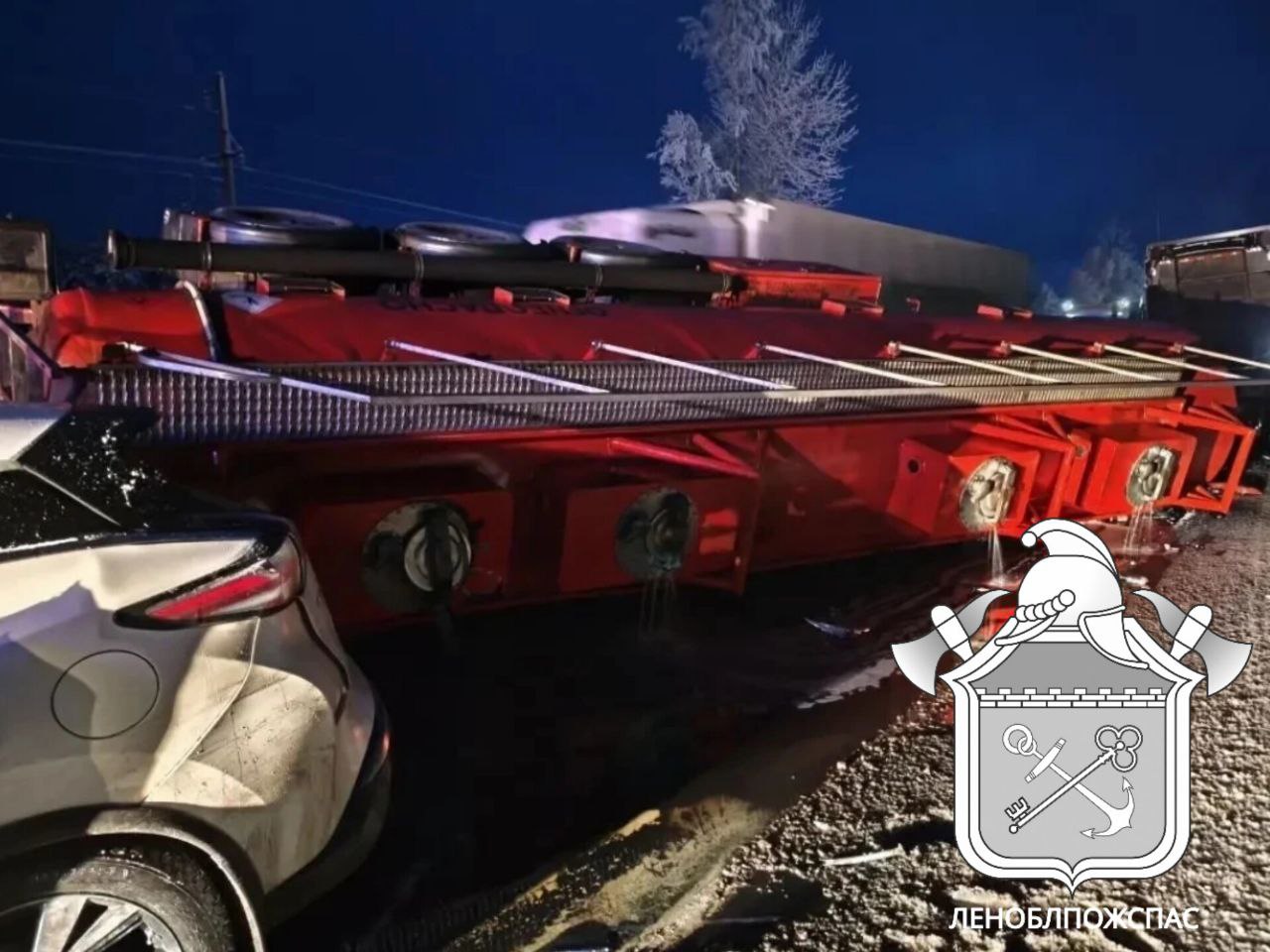 Позднее появилась информация о том, что в 21.30 на место происшествия приехал автокран для подъема цистерны. Там же работает дорожная служба, «02», «03», личный состав 148 пожарной части Волховского отряда Леноблпожспас, ПСО из города Новая Ладога аварийно-спасательной службы. Движение перекрыли в обе стороны из-за большого разлива топлива на трассе, сообщили в официальном телеграм-канале ГКУ «Ленинградская областная противопожарно-спасательная служба».