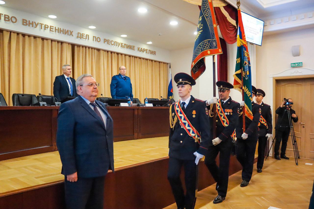 В завершение заседания сотрудникам, отличившимся в прошедшем году, вручили награды. Переходящее знамя МВД по Республике Карелия было вручено коллективу ОМВД России по Прионежскому району.