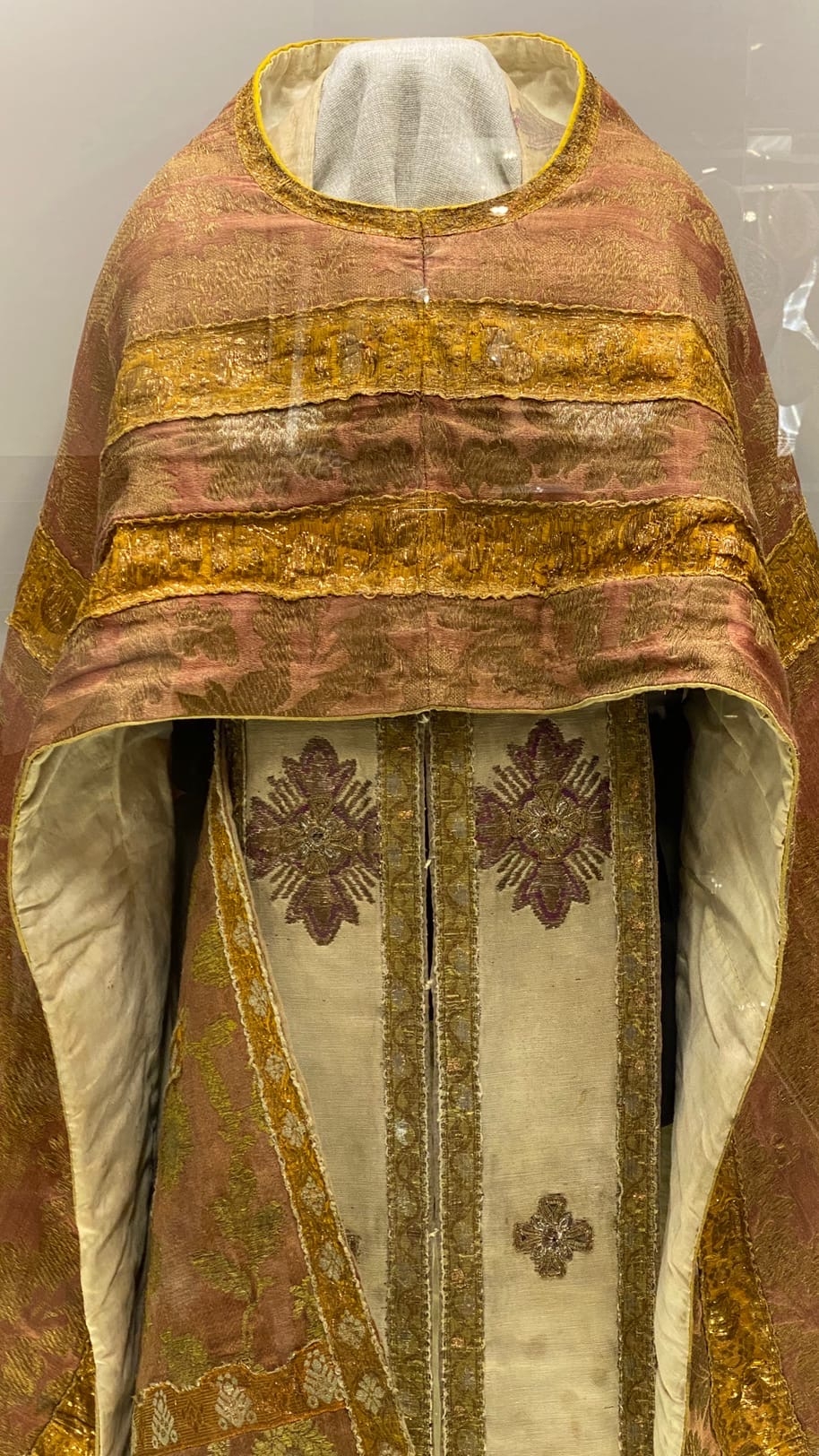 Среди экспонатов — образцы церковного искусства: золотошвейные облачения священников, вышитые иконы, а также изысканные головные уборы и наряды олонецких женщин. Выставка также познакомит посетителей с технологиями создания золотных нитей, тесьмы и драгоценных тканей.