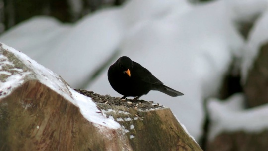 Чёрными как уголь у дроздов бывают исключительно кавалеры. У красавца-жениха на тёмном фоне выделяется ярко-жёлтый клюв и жёлтая обводка вокруг глаз. А вот самка имеет неприметное, бурое оперение. Нередко эти птицы остаются зимовать в Ленинградской области и даже в Санкт-Петербурге, хотя основная их часть улетает от нас на зимовку в Западную Европу.