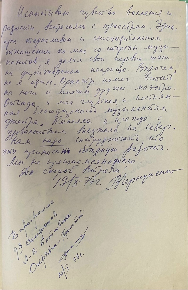 В сообщении отмечается особая связь маэстро с Карелией. Одна из его первых крупных работ состоялась в 1967 году с Симфоническим оркестром Карельского телевидения и радио. Тогда он дирижировал Второй симфонией Салманова и «Песнями и плясками смерти» Мусоргского. Сам Чернушенко позже вспоминал, что именно здесь, при терпеливом отношении музыкантов, он делал свои первые шаги на дирижерском поприще.