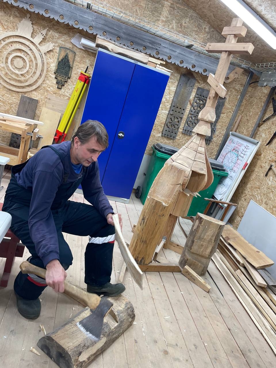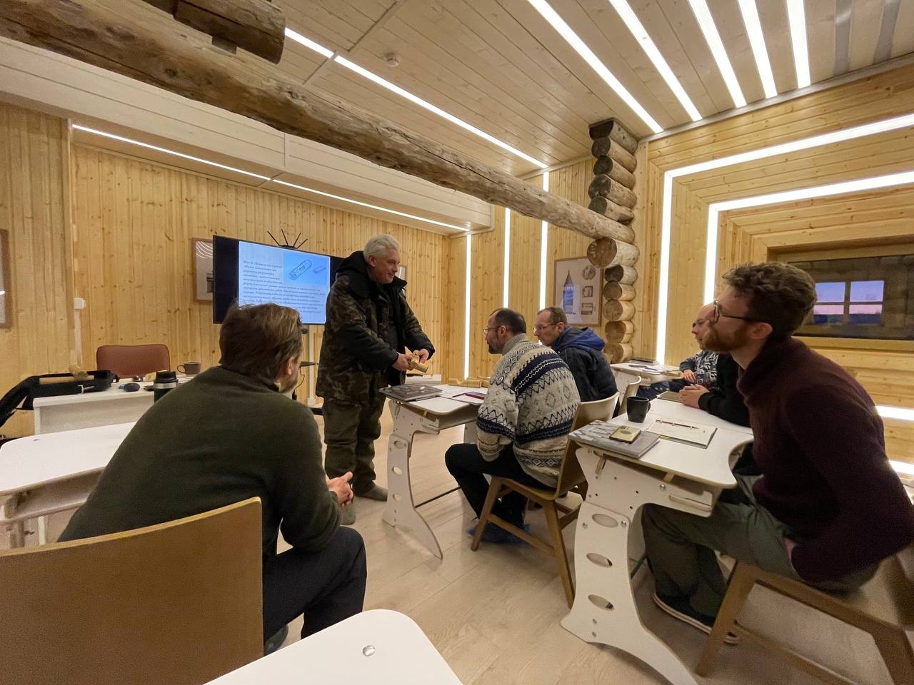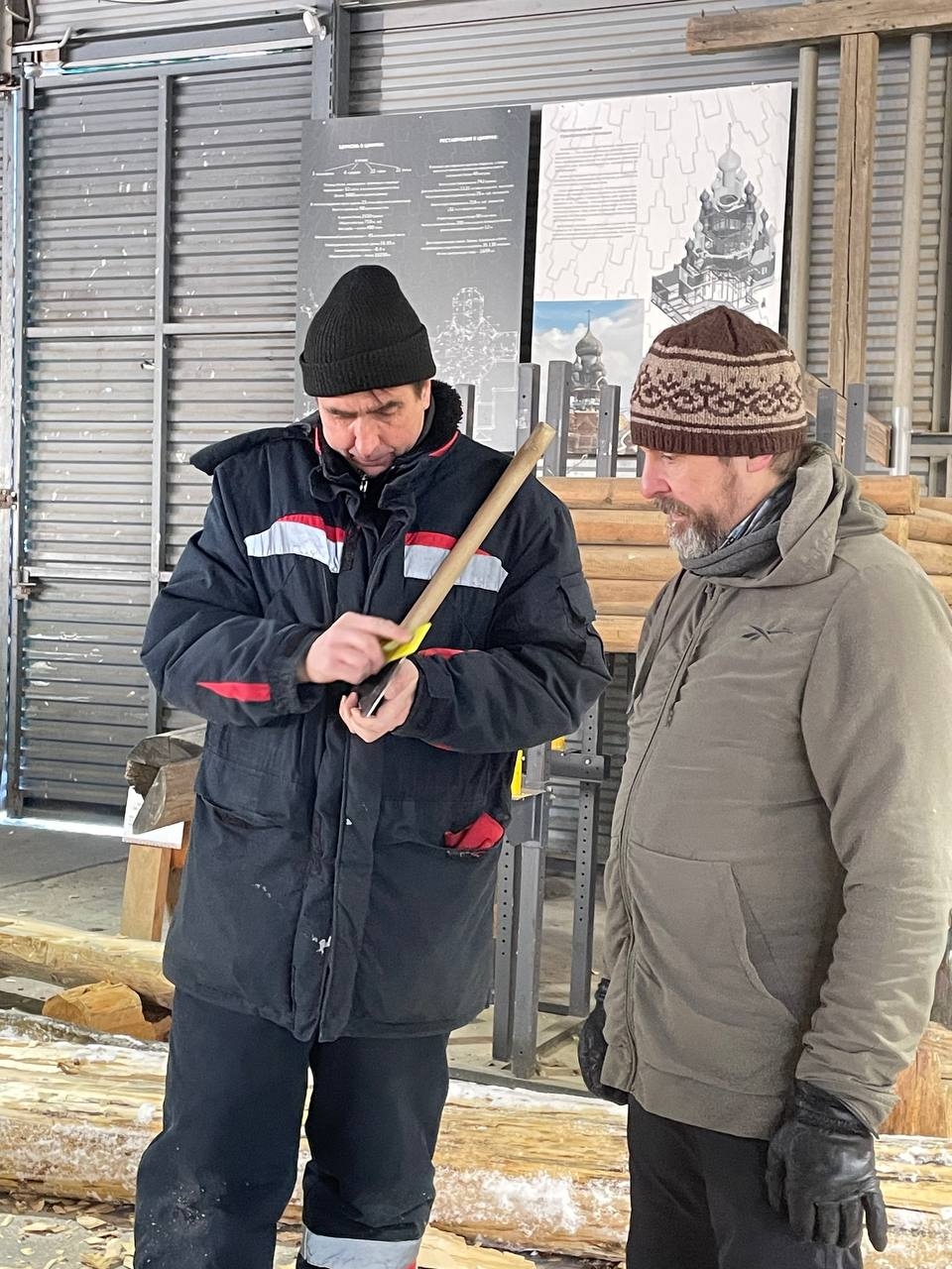 Сегодня мастера работали на морозе, но на площадке от процесса жарко, не смотря на погоду. Реставратор высшей категории Андрей Львович Ковальчук на макетах показал группе основные приемы и методы реставрации исторических элементов сруба.