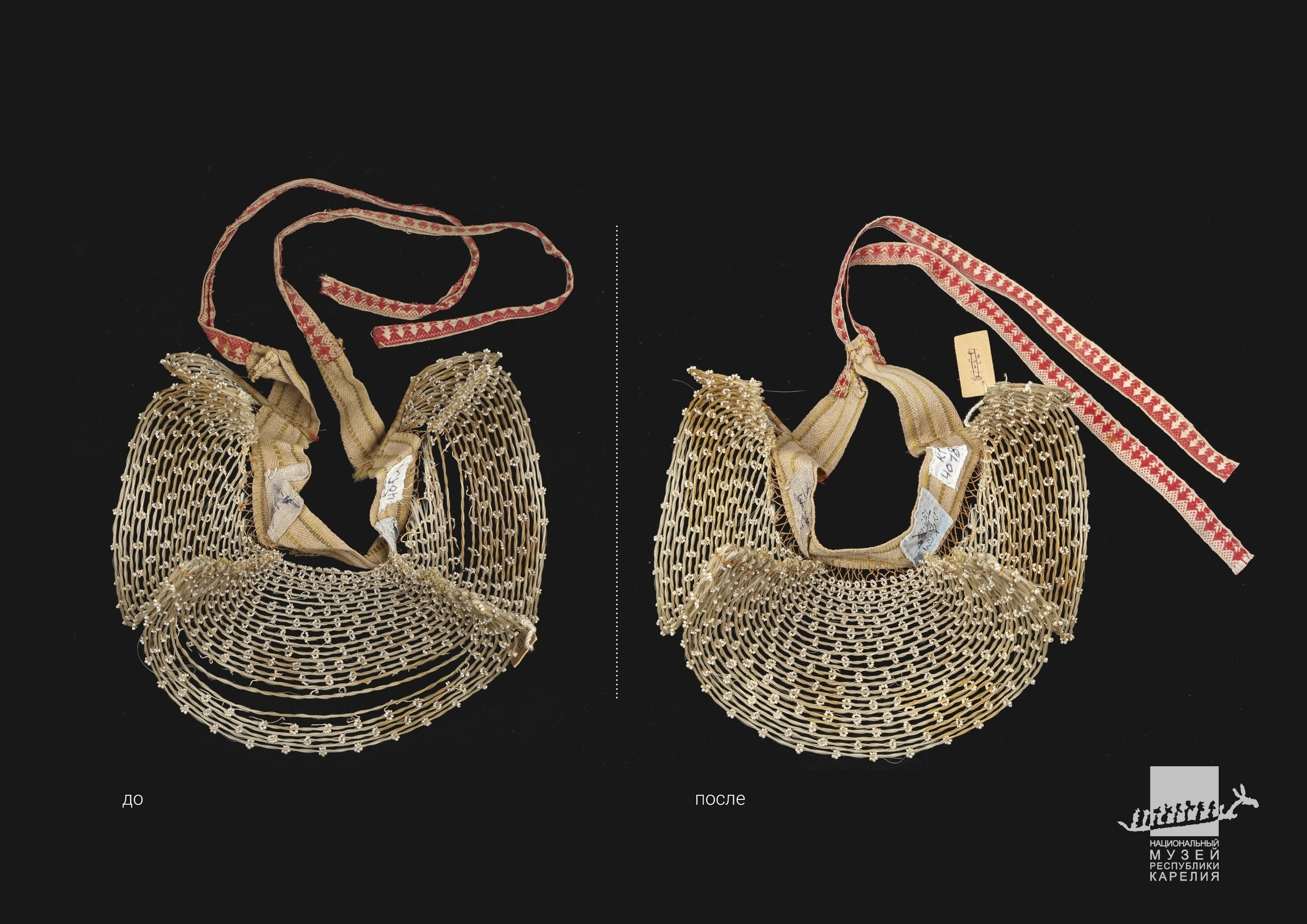 В реставрационных мастерских Нацмузея есть особое направление — восстановление предметов из речного жемчуга и белого конского волоса. Речь идет о традиционных карельских женских украшениях: жемчужных и бисерных сережках, а также головных сетках-поднизях, которые когда-то носили над лбом как праздничное убранство.