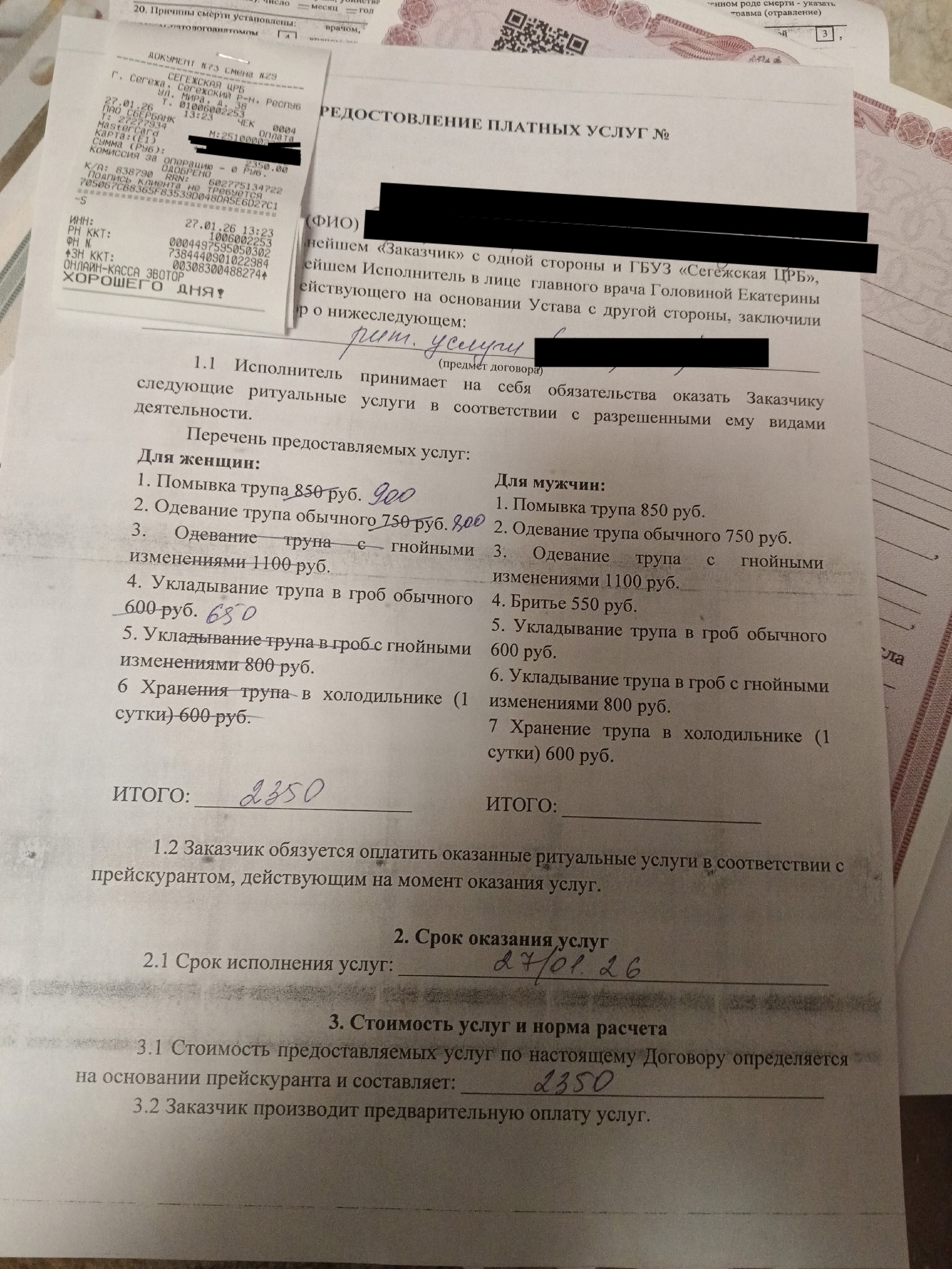 «Я выскажусь и напишу жалобу в вышестоящие инстанции. Нельзя наживаться на чужом горе. Это как минимум бесчеловечно. В сегежском морге медсестра, которая отвечает за услуги по приведению усопшего в порядок перед похоронами, а именно по просьбе было: подкрасить губы, завязать платок на голову (чтобы прикрыть следы вскрытия , если таковые бы имелись), положить в гроб определённые вещи, «выставила» счет наличными (шёпотом, еле внятно, дословно «за отдельную плату»), что по договору предоставления платных услуг не идет. (Прикреплю) Да и на самом деле договор, по которому оплачивают услуги морга через кассу, на третьем этаже хирургического корпуса, тоже фикция. Нет печати, исправление цен за услуги, причём по факту, ручкой, перед вручением родственникам, подпись на обратной стороне договора отсканирована и распечатана», — написала сегежанка в соцсети.