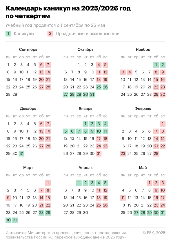 Летние каникулы Минпросвещения рекомендует провести с 27 мая по 31 августа 2026-го. Однако окончание учебы у учащихся 9-х и 11-х классов будет зависеть от расписания Государственной итоговой аттестации (ГИА).
