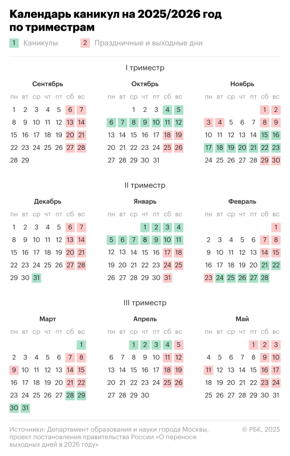 Школам, которые работают по четвертям, рекомендовано провести весенние каникулы с 28 марта по 5 апреля 2026 года. Это следует из рекомендаций Минпросвещения России.