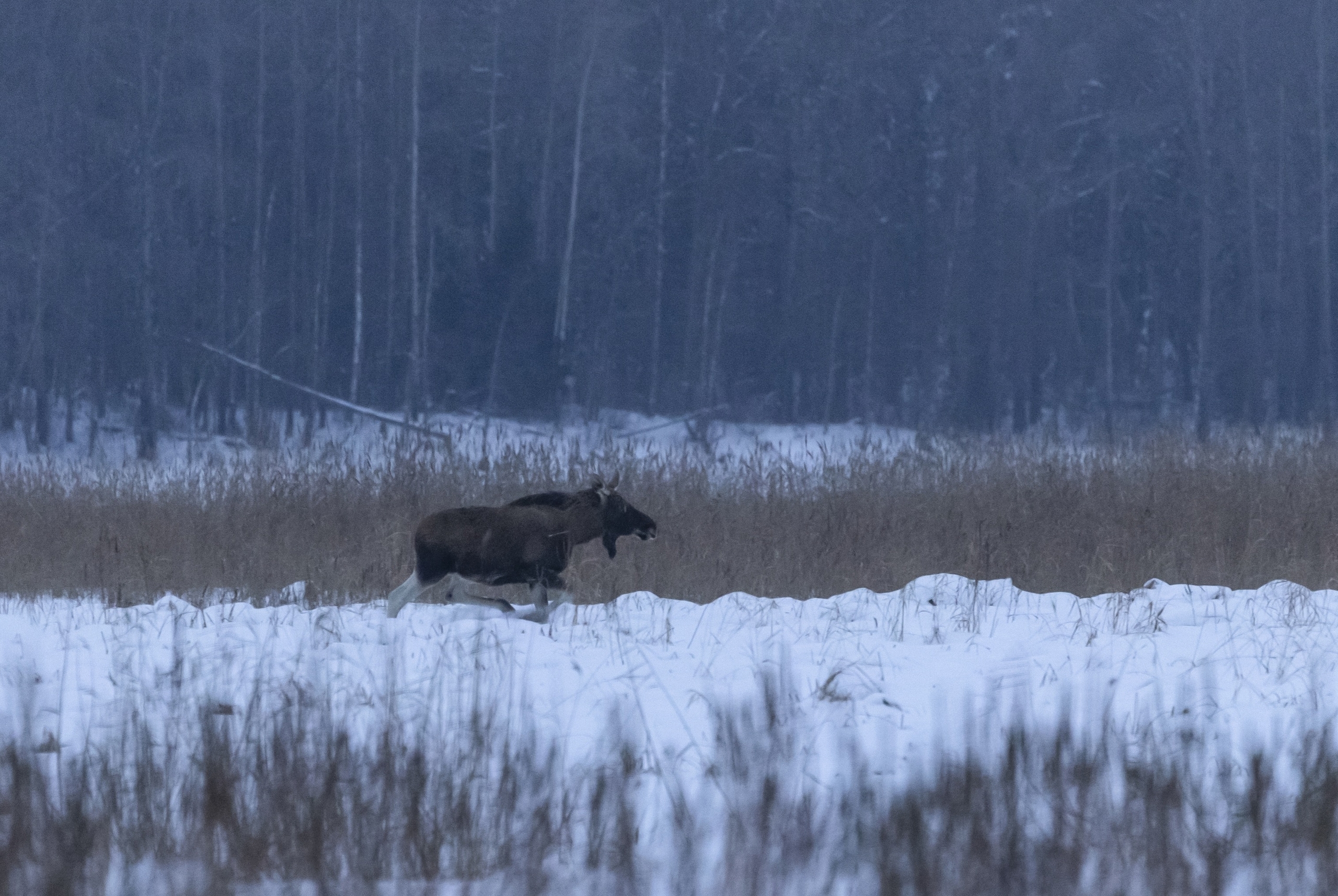 Зимой на севере лоси ищут открытые места, где еще можно полакомиться пожухлой травой или ветвями ив. В сильные морозы они ложатся в рыхлый снег. Над его поверхностью могут торчать только холка и голова. Так животные сохраняют тепло. Cкоро весна и лоси смогут найти себе больше пищи.