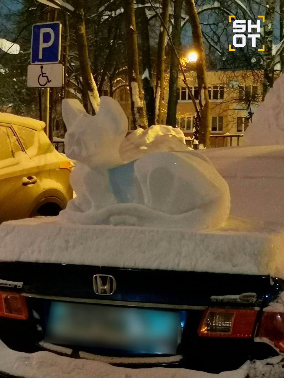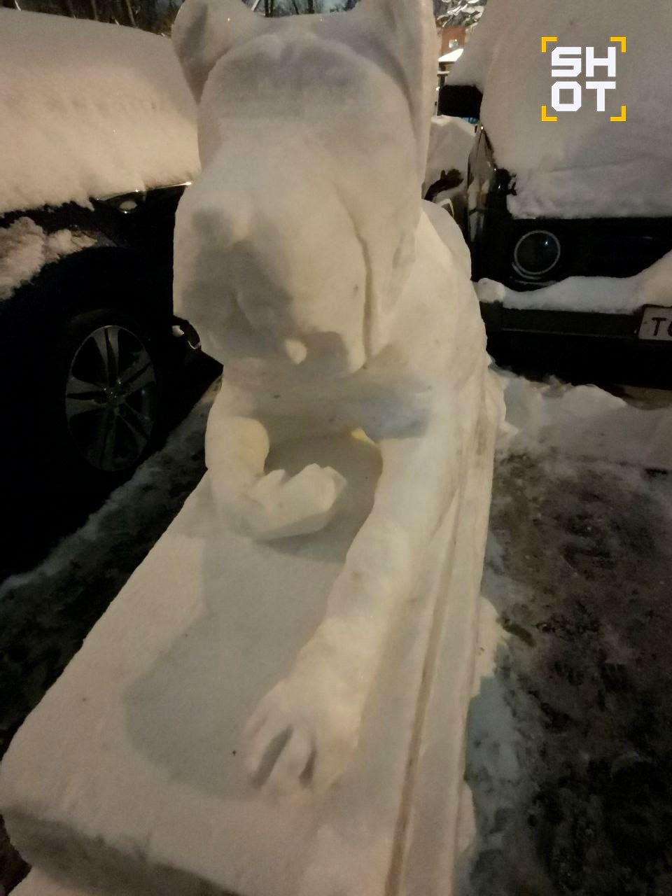 Как пишет Lenta.Ru, на фотографиях, сделанных одним из очевидцев, можно увидеть фигуры льва, кота и двух собак, которые слепил местный житель. Некоторые из снежных скульптур горожанин создал прямо на автомобилях.