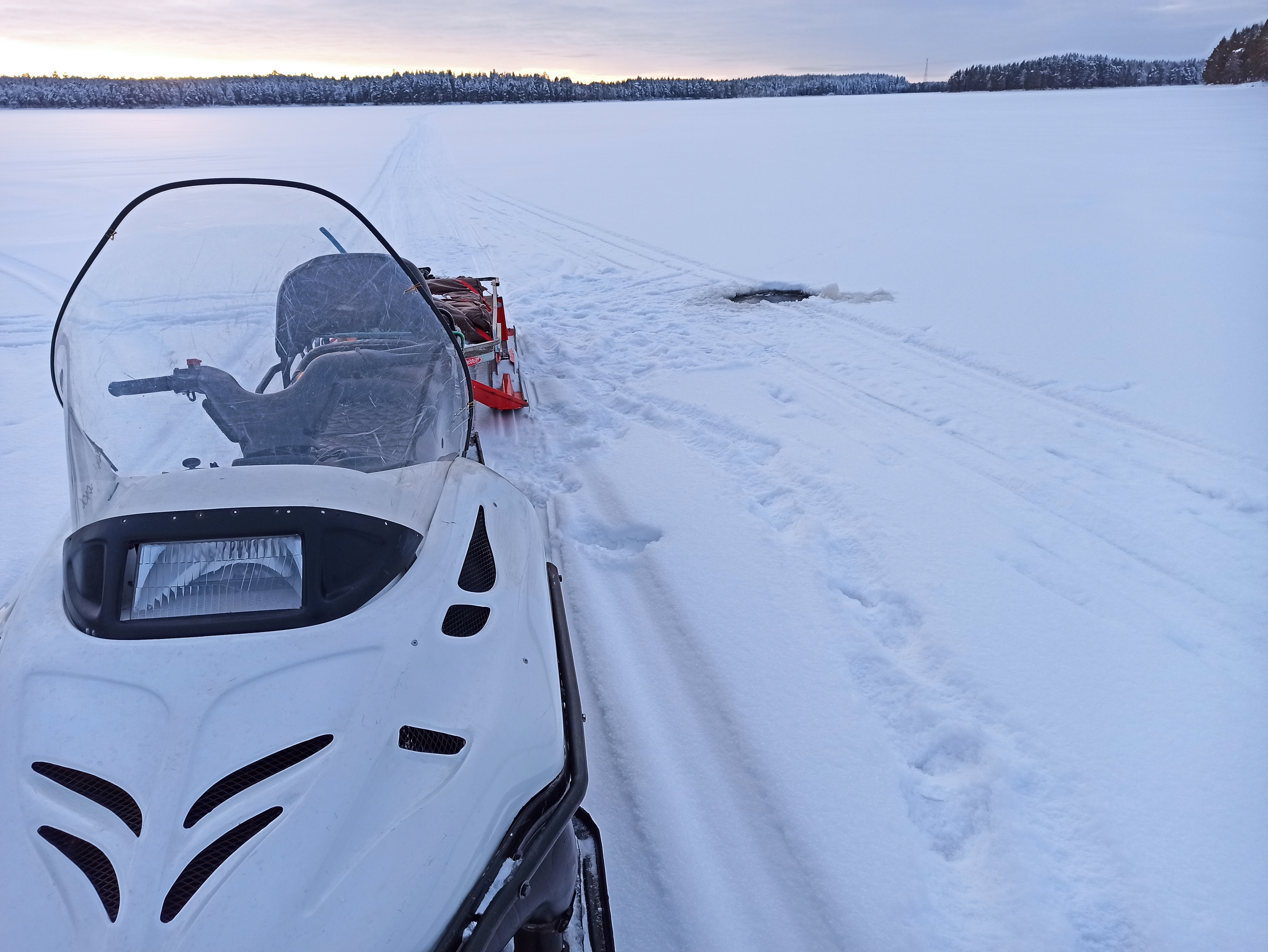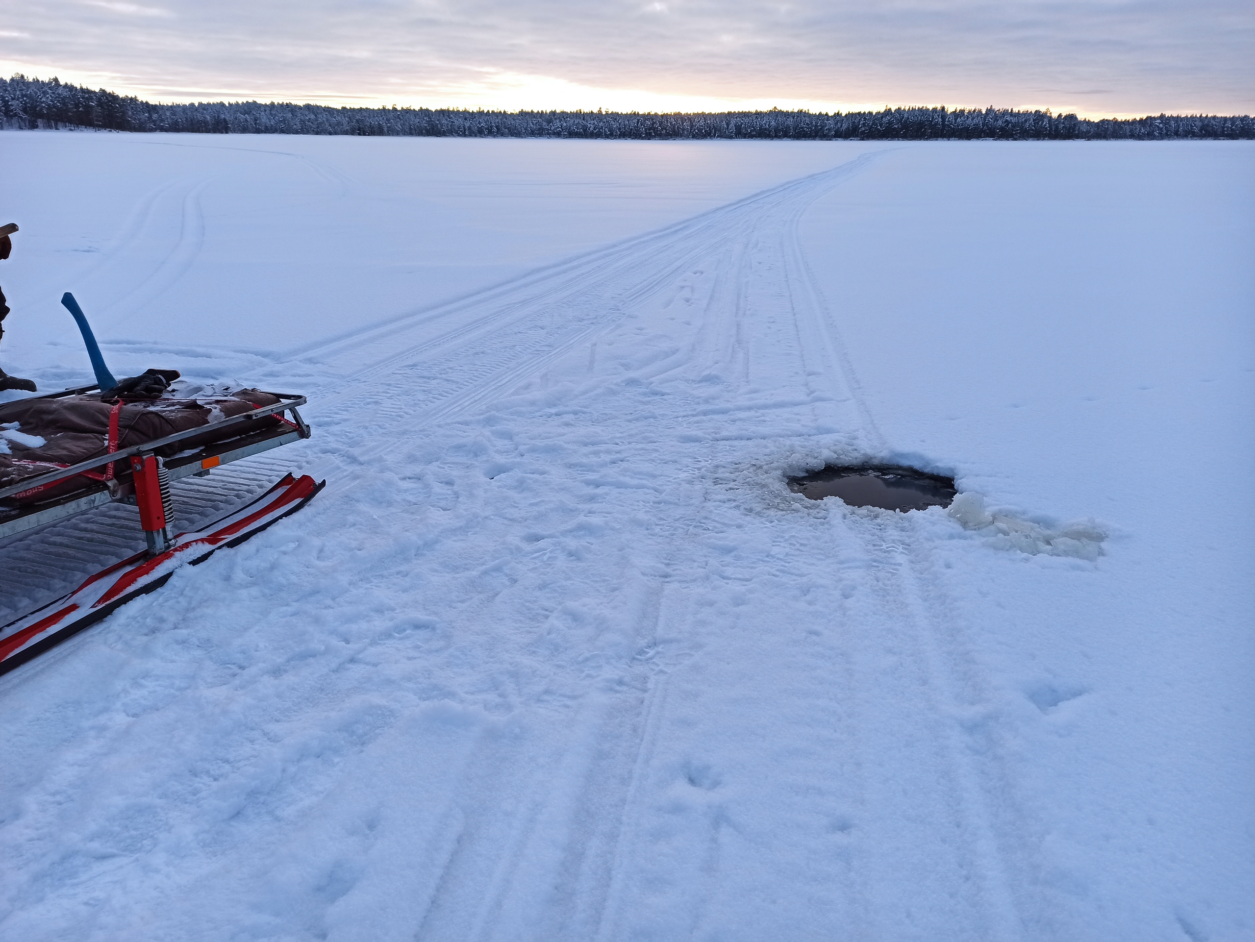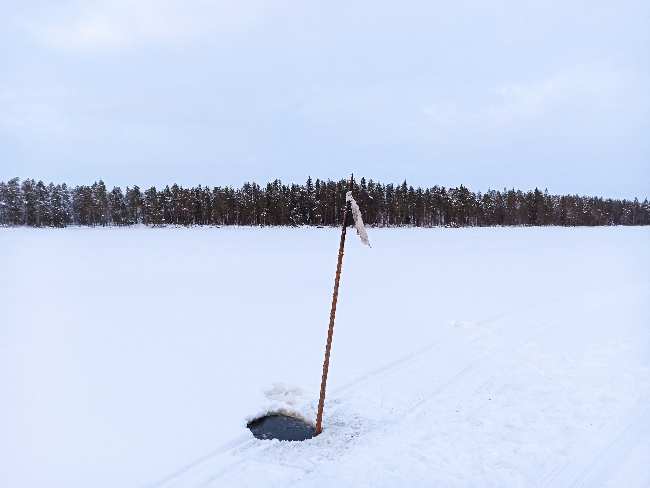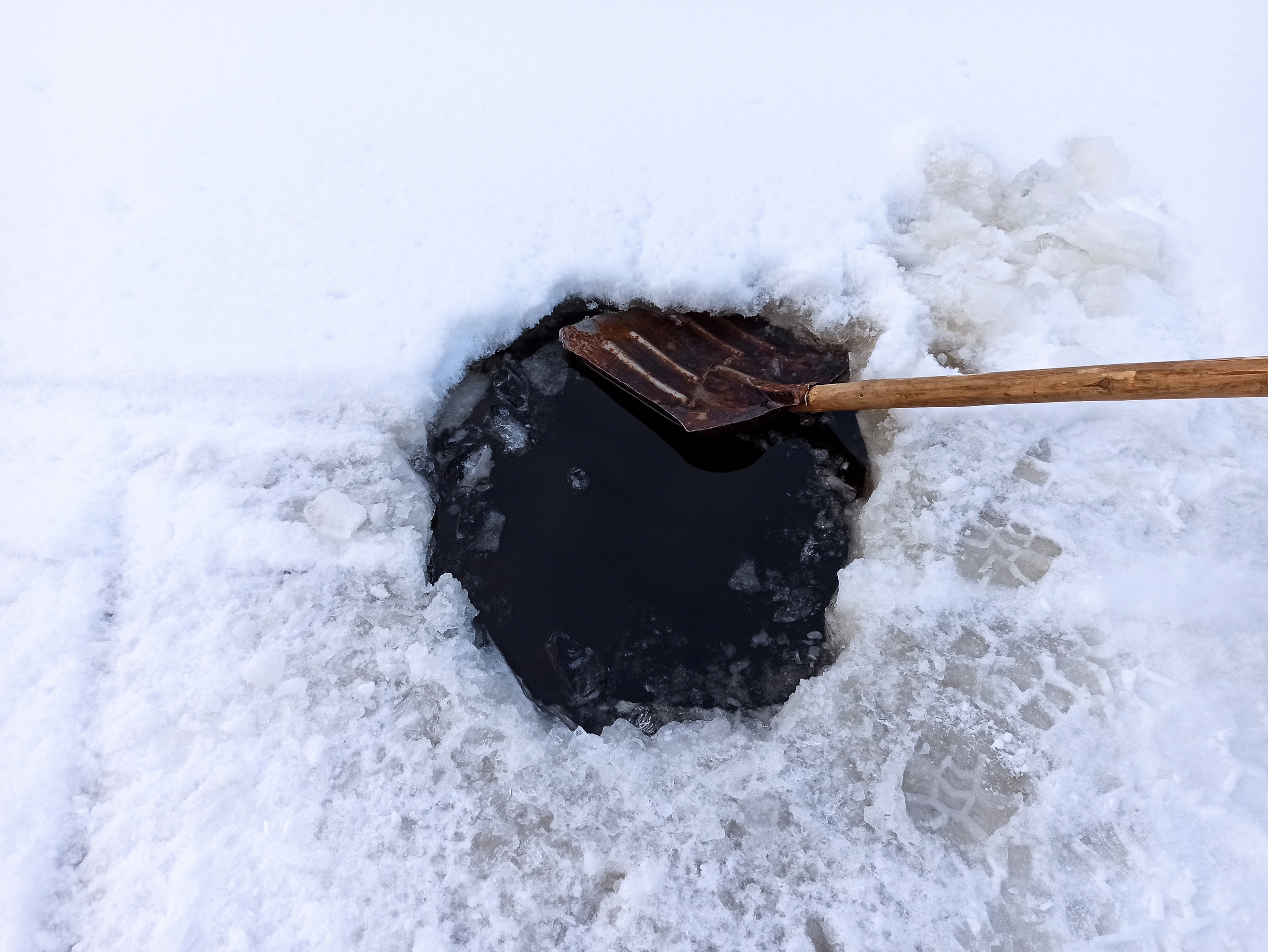«Внешне место практически не отличается от окружающего ледового покрова, но при установлении теплой погоды наверняка будет представлять опасность и для рыбаков, и для снегохода. Для предупреждения граждан в прорубь установлен длинный шест с флажком. Просим быть внимательными при движении по льду водоемов, и не очень доверять красивому «снежному одеялу»», — предупредили специалисты ГИМС.