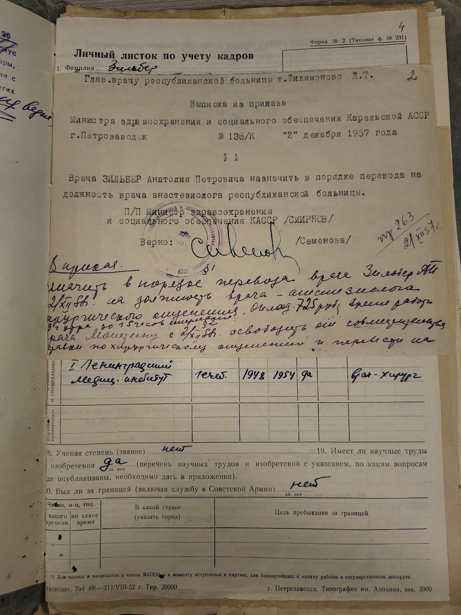 50-е годы — это годы возникновения того, что стало анестезиологией. В это время возникает нейролептанальгезия, многокомпонентный наркоз. Профессия становится интеллектуальной, сложной, требующей от врача глубоких знаний физиологии. Вот в этот момент А. Зильбер становится анестезиологом, начинает обучать сестер и врачей в больнице. В 1959-м благодаря Анатолию Петровичу в больнице открывается одно из ПЕРВЫХ в СССР отделений интенсивной терапии и реанимации.Это был прорыв! С него началась история спасения тех, кого ещё вчера считали безнадежными. Именно у нас, в Петрозаводске.
