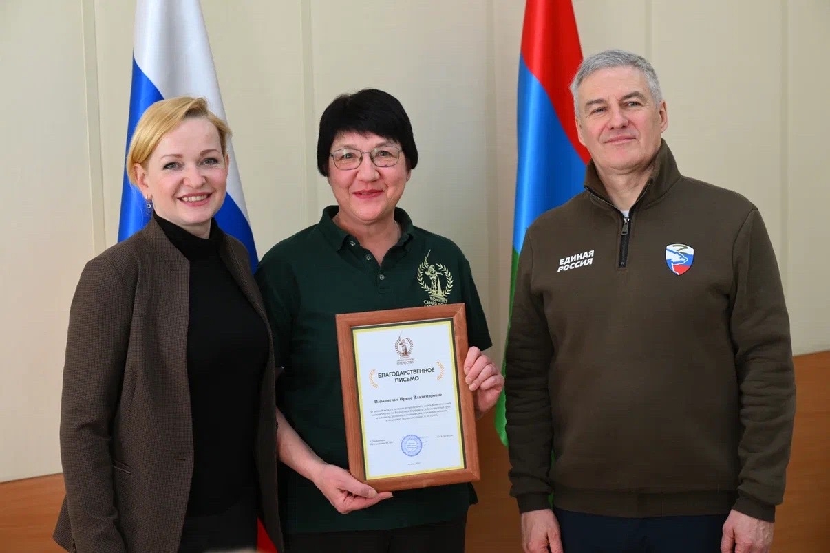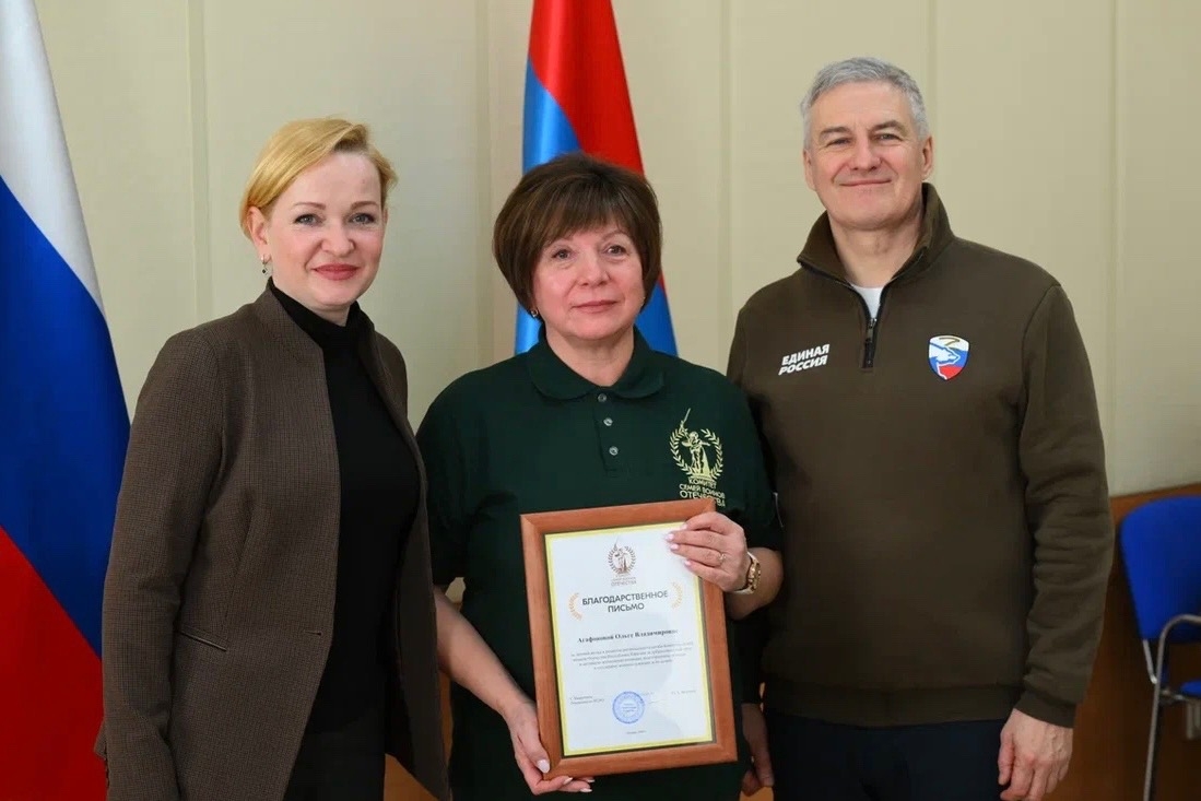 Юлия Белехова вручила благодарственные письма руководителю регионального штаба Комитета семей воинов Отечества Ирине Тучиной и другим активным членам штаба.