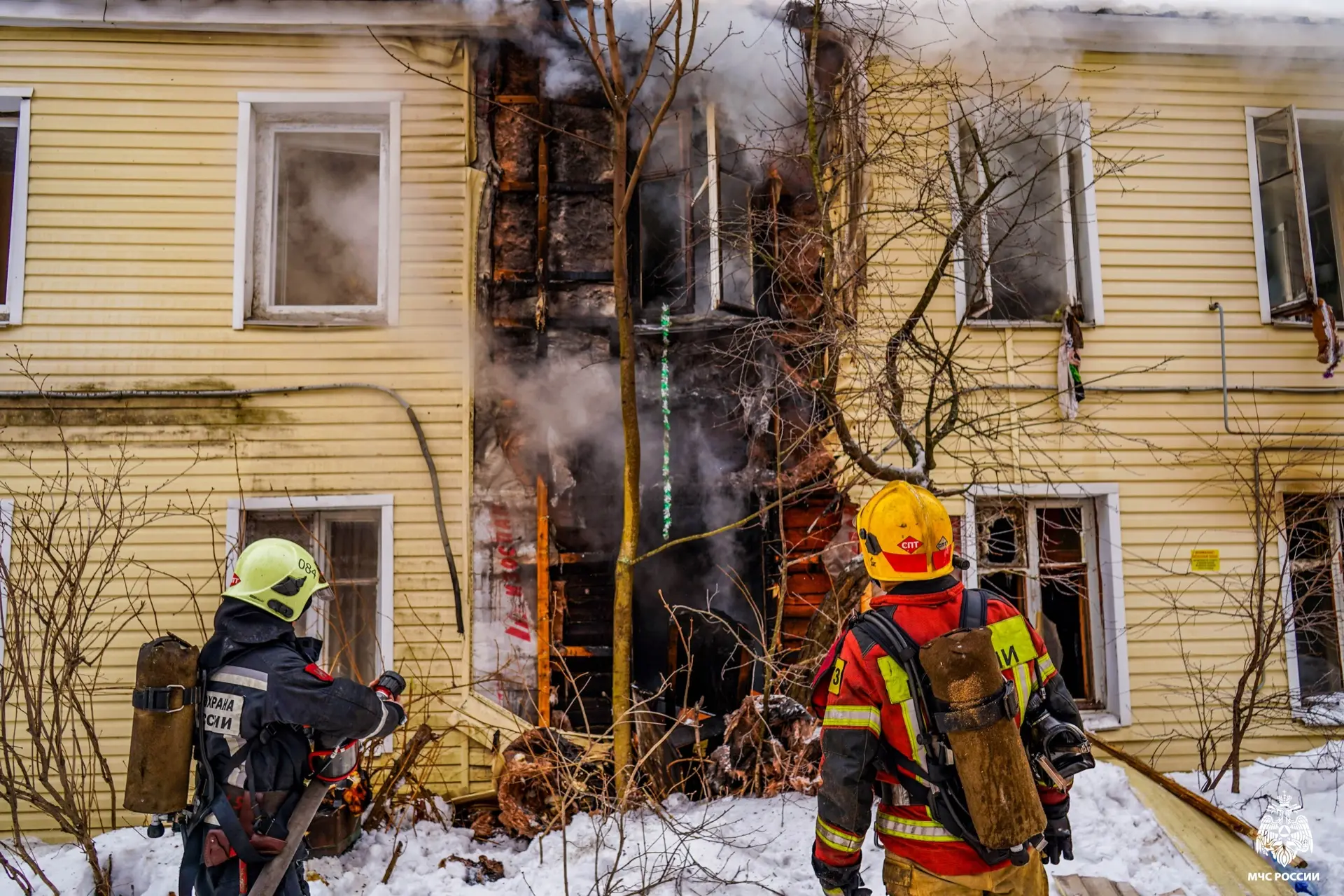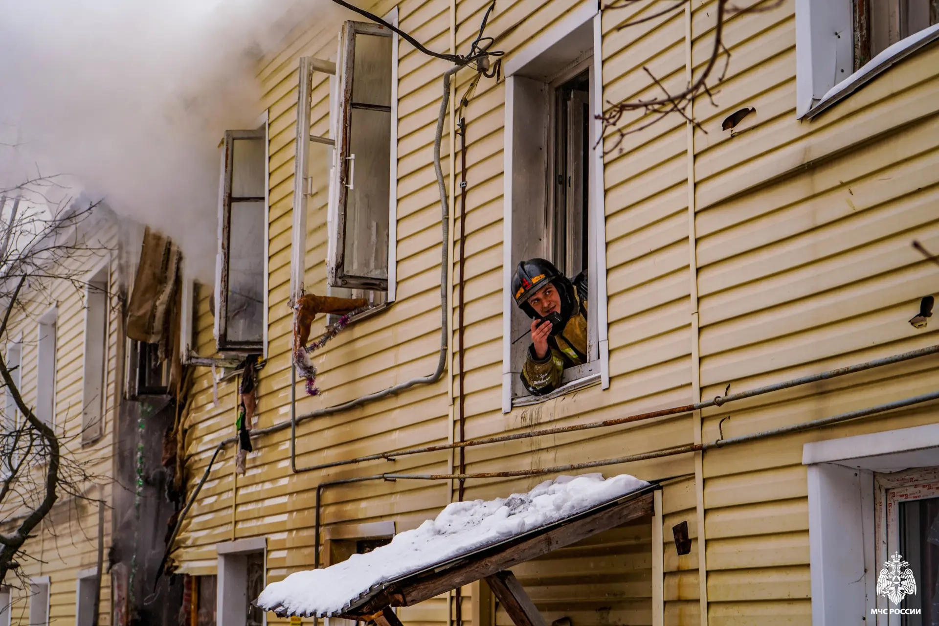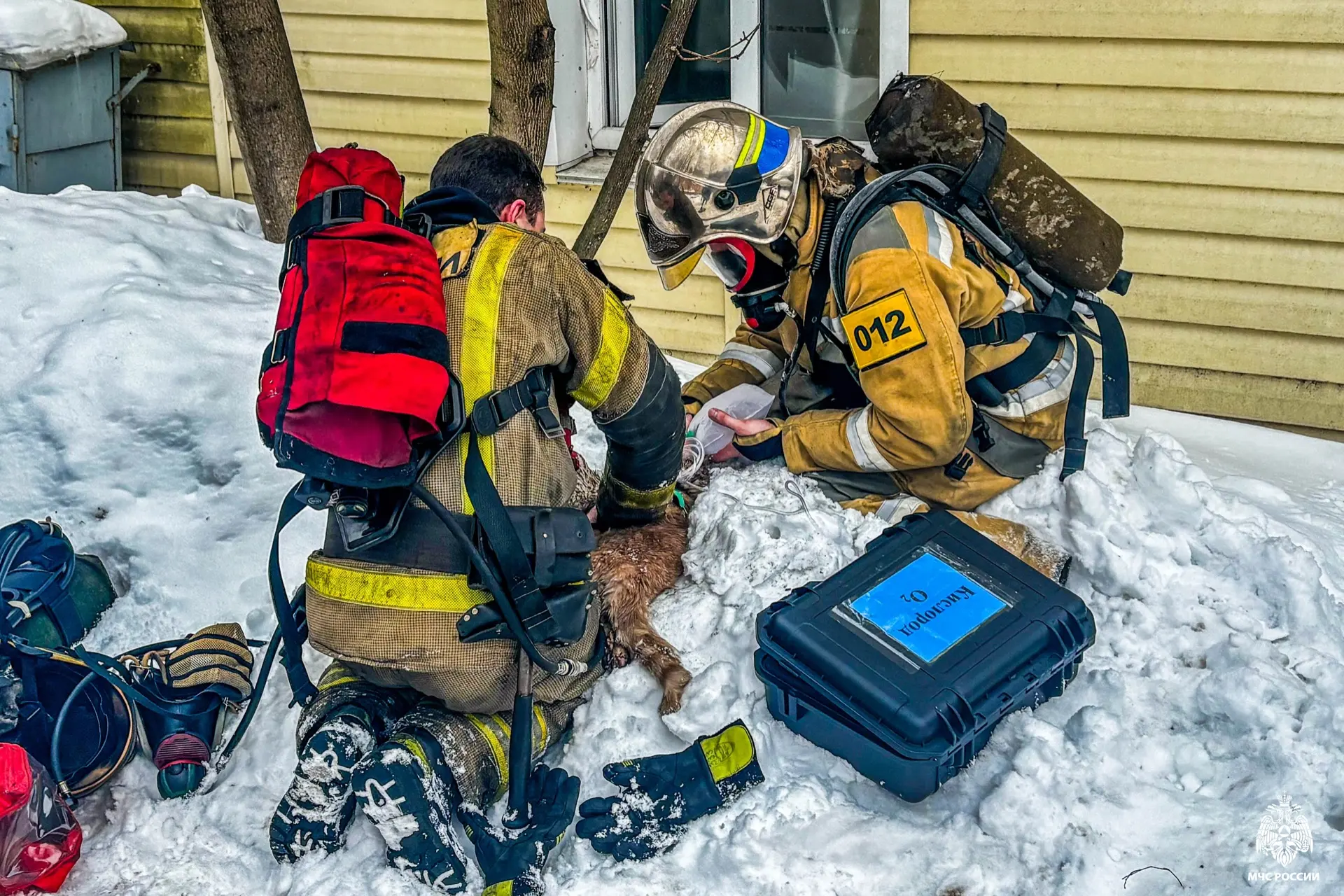 Огнеборцы эвакуировали из здания людей и домашних животных. Ведомство опубликовало фото с места происшествия, на которых видно, как пожарные выходят из задымленного помещения на мороз. Из-за разницы температуры тела и холодного воздуха от спасателей буквально идет пар.