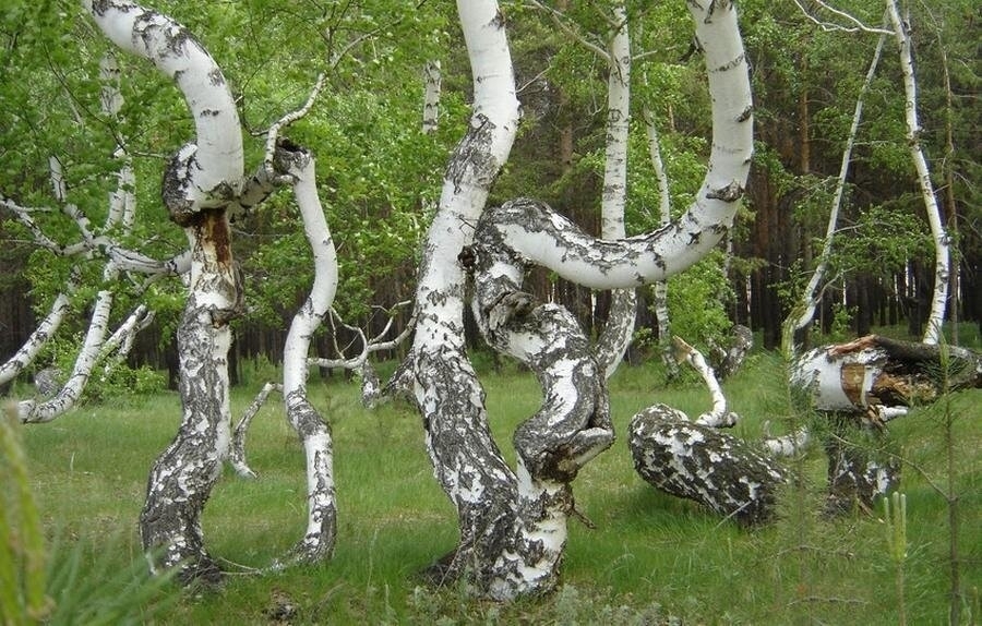 Еще одна танцующая роща находится на севере Волгоградской области. В этом лесу нет ни одного прямого дерева. У всех берез — кривые, покореженные стволы. Причем, по наблюдениям местных жителей, если кривую березу срубить, на ее месте потом вырастет тоже кривое дерево.