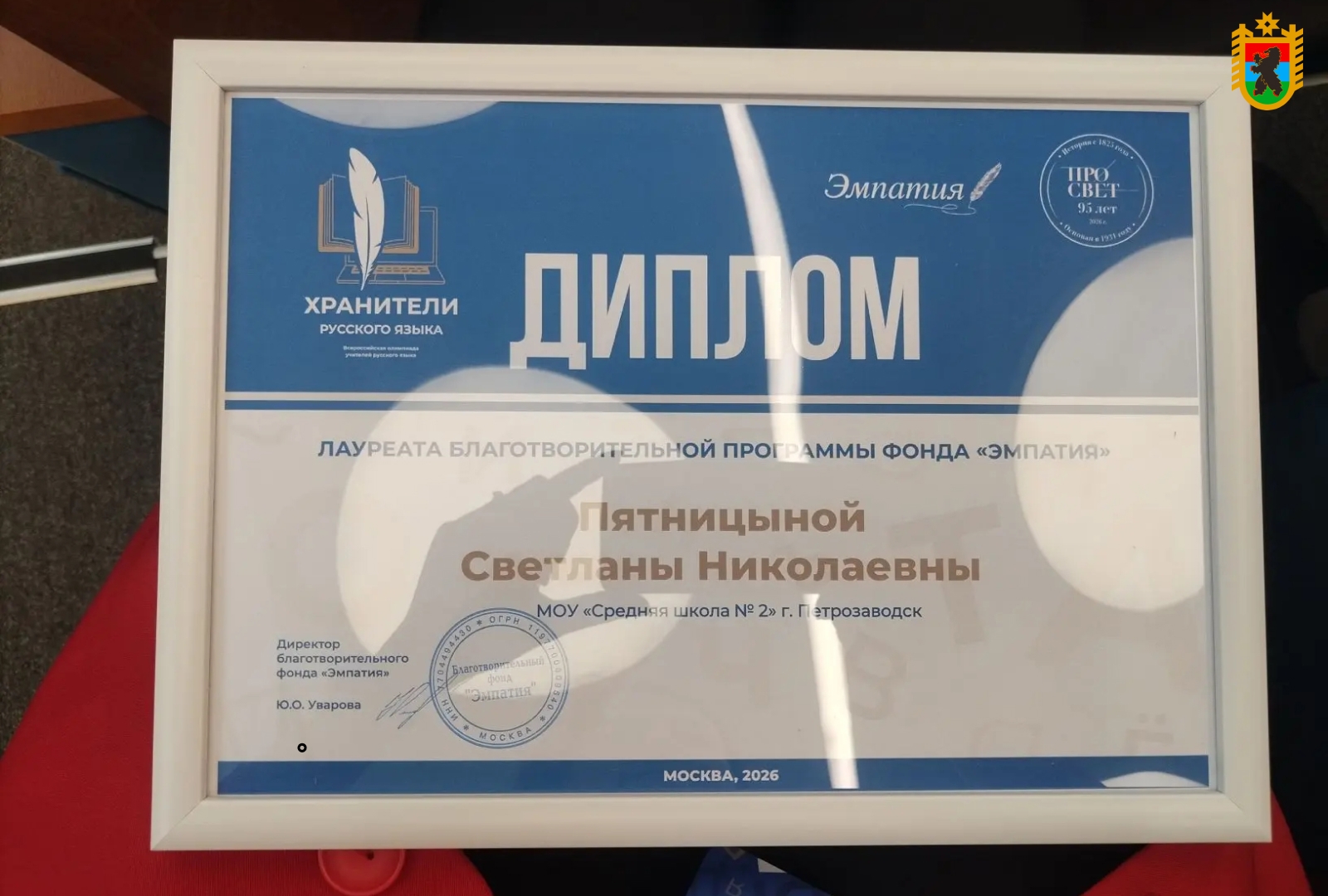 Паблик «Республика Карелия» сообщил, что учитель русского языка и литературы из петрозаводской школы № 2 Светлана Пятницына стала лауреатом Всероссийской олимпиады «Хранители русского языка».