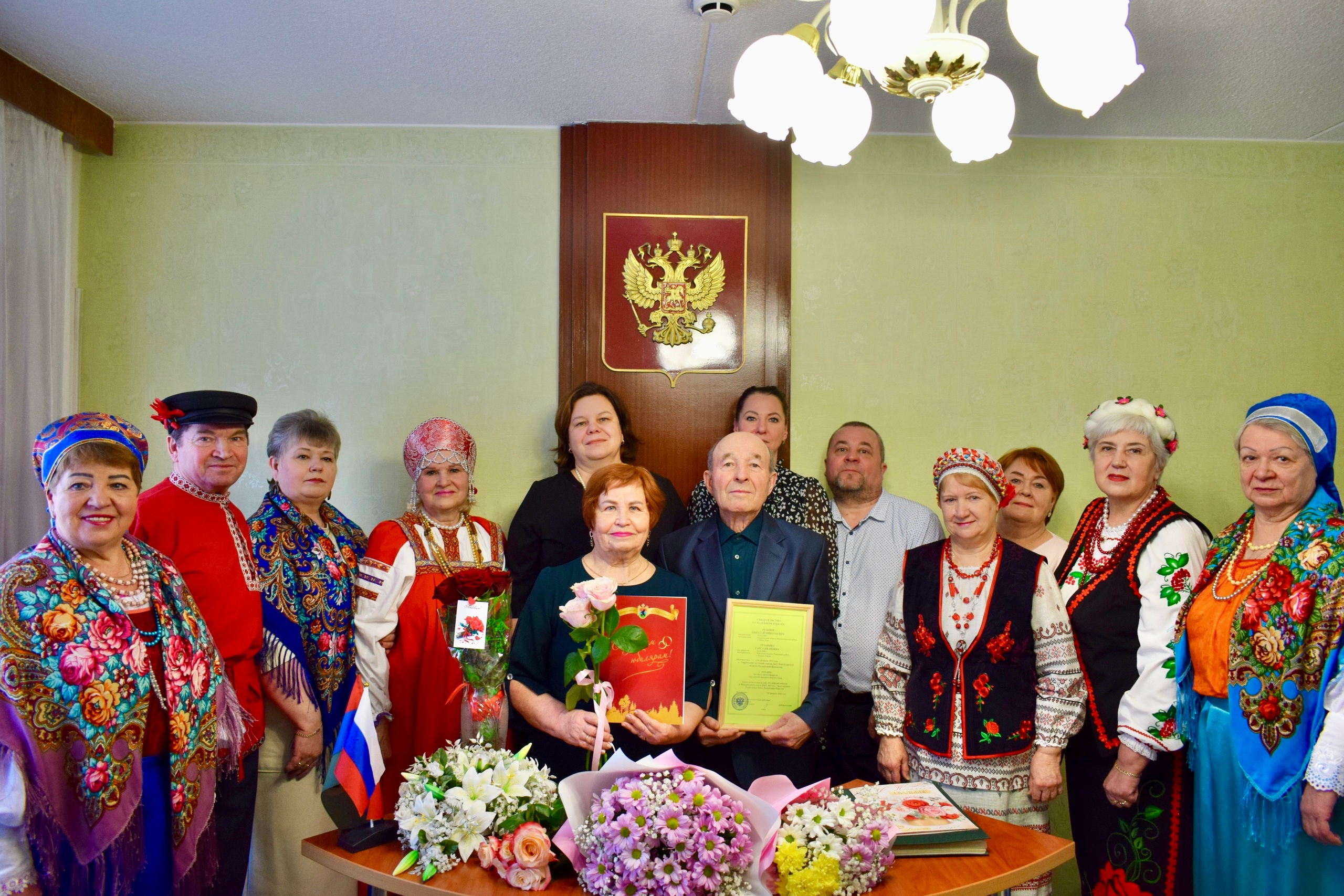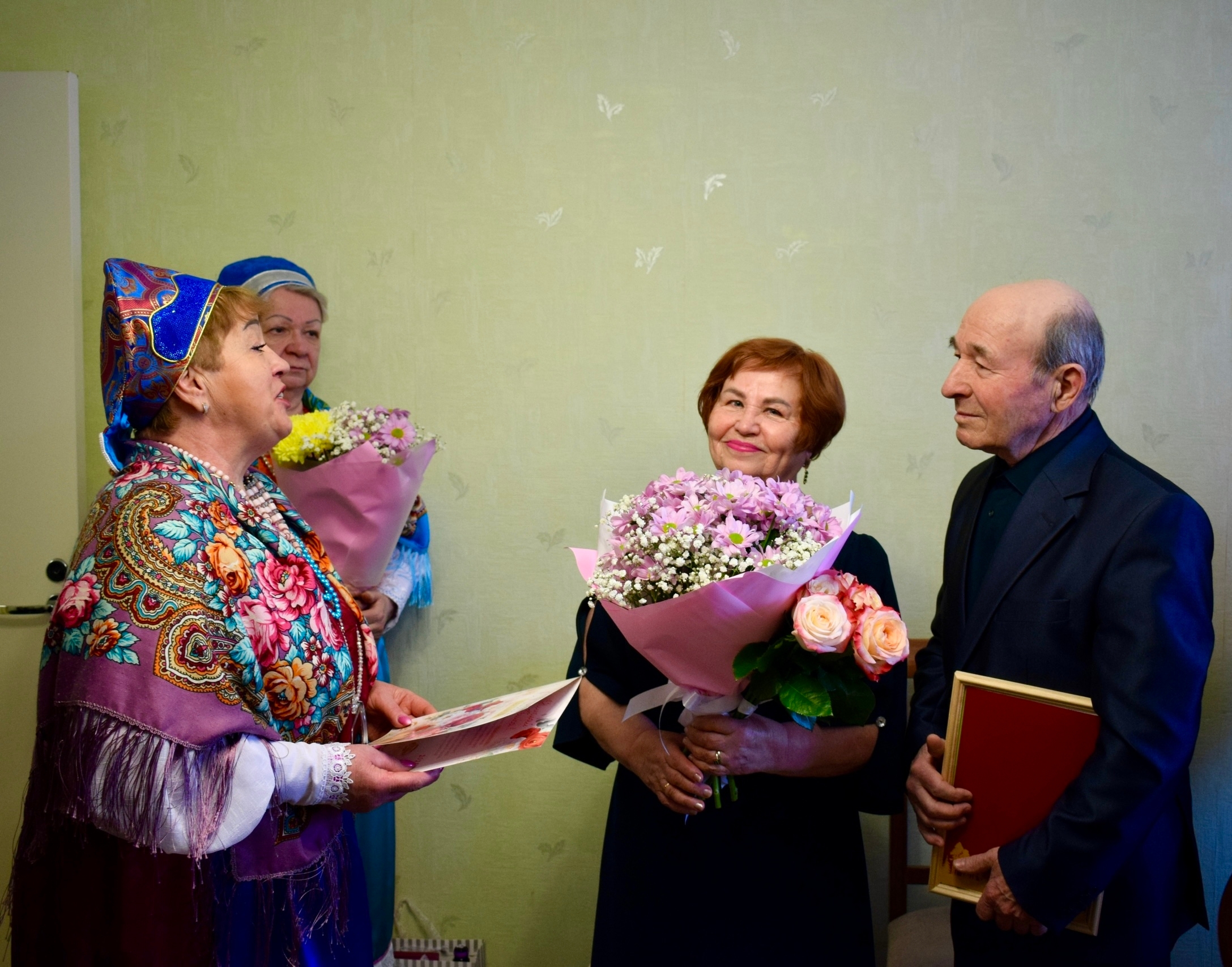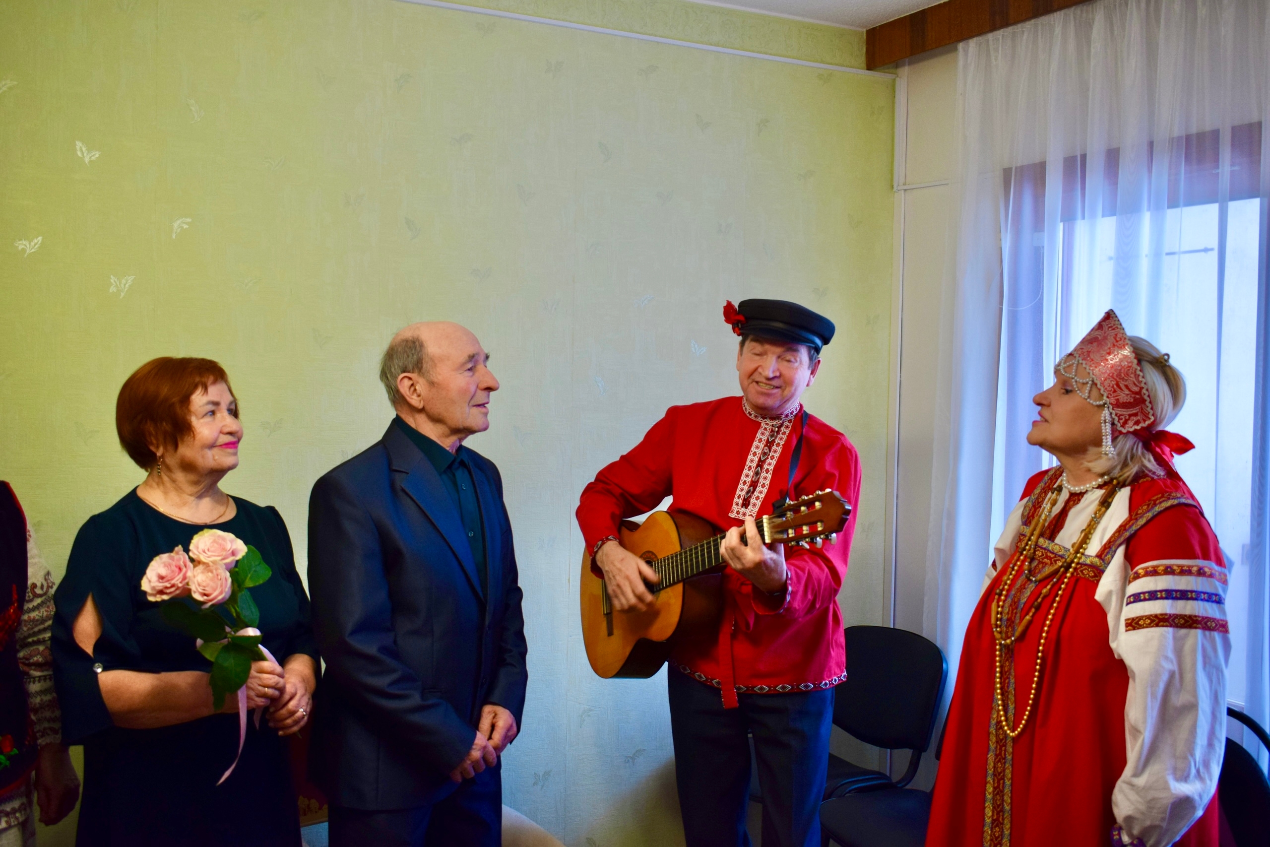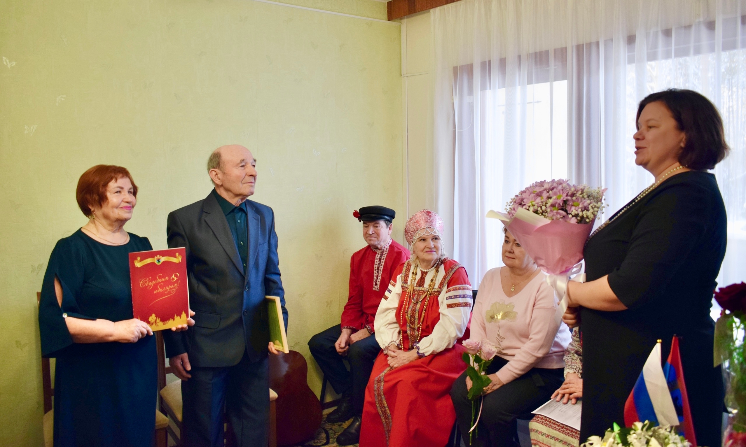 На празднование юбилея пришли председатель Совета округа Елена Соболева, родные, друзья, а также представители общества карельской культуры «Виена», дуэт «Веретено» и ансамбль украинской песни «Мрия». Гости подарили юбилярам тёплые слова, пожелания здоровья, долголетия и семейного тепла.