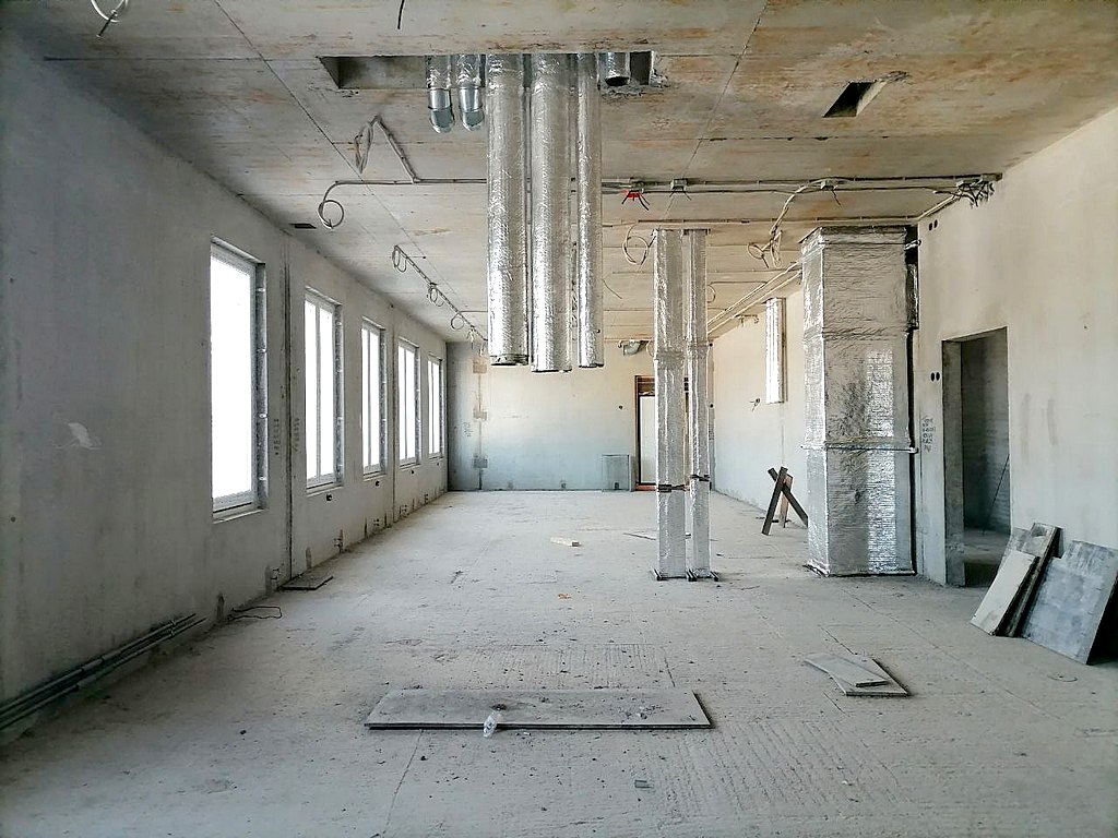 На объекте уже установлены оконные блоки здания и витраж входной зоны. Завершается утепление фасадов и ведется их облицовка. Внутри здания выполняются работы по устройству вентиляционной системы, кирпичных перегородок пищеблока, прокладке сетей водопровода, бытовой и ливневой канализации, электроснабжения. Ведутся кровельные работы.