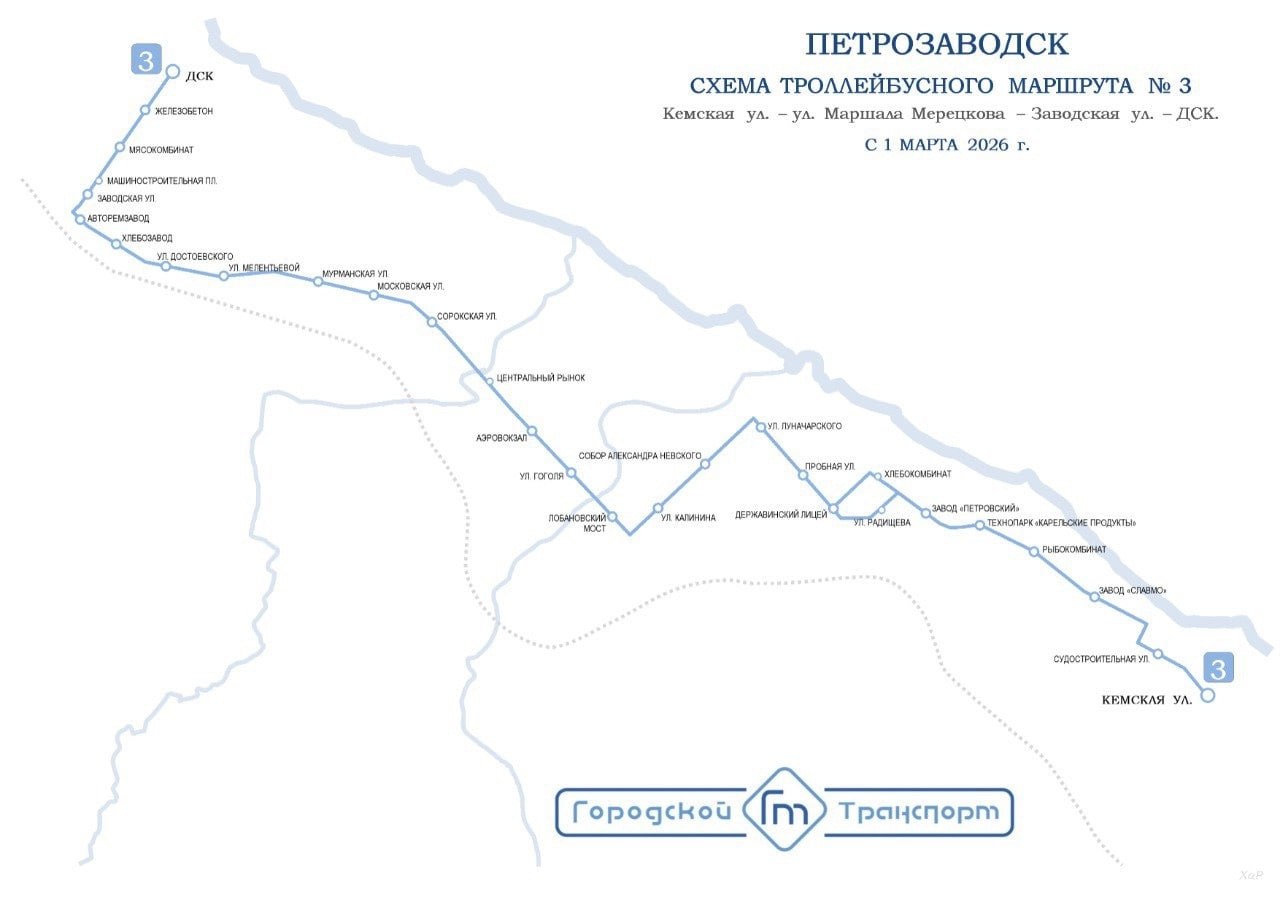 Конечная станция «Кемская улица» – Судостроительная площадь – Судостроительная улица – улица Онежской Флотилии – улица Ригачина – улица Чернышевского – улица Луначарского – проспект Александра Невского – улица Маршала Мерецкова –улица Антикайнена – Первомайский проспект – площадь Шуйское Кольцо – Заводская улица –Машиностроительная площадь – Заводская улица – Заводская площадь – Конечная станция «ДСК» – Заводская площадь – Заводская улица – площадь Шуйское Кольцо – Первомайский проспект – улица Антикайнена – улица Маршала Мерецкова – проспект Александра Невского – улица Луначарского – улица Радищева – улица Ригачина – улица Онежской Флотилии –Судостроительная улица –Судостроительная аллея –Конечная станция «Кемская улица».