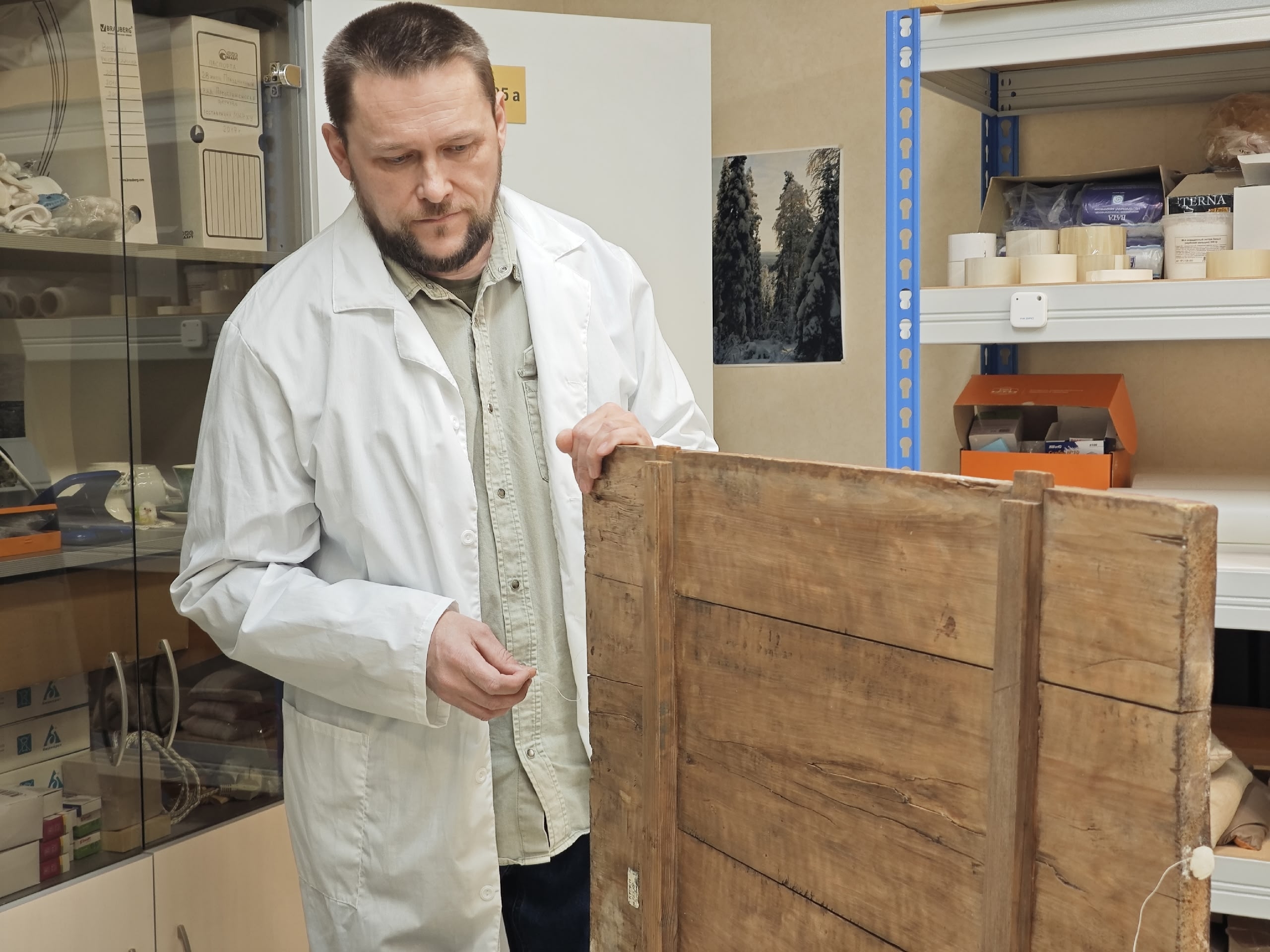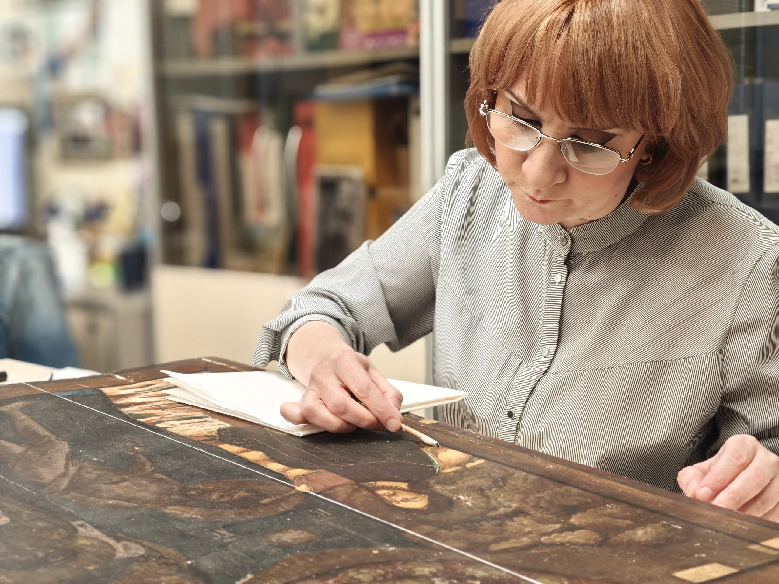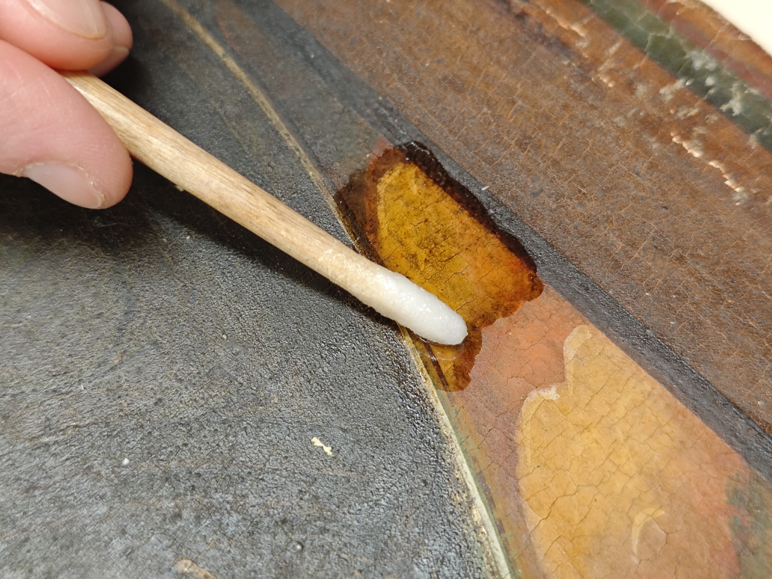 Реставратор темперной живописи Надежда Куусела уже приступила к раскрытию авторского слоя. Михаил Фролов занимается укреплением деревянной основы иконы.