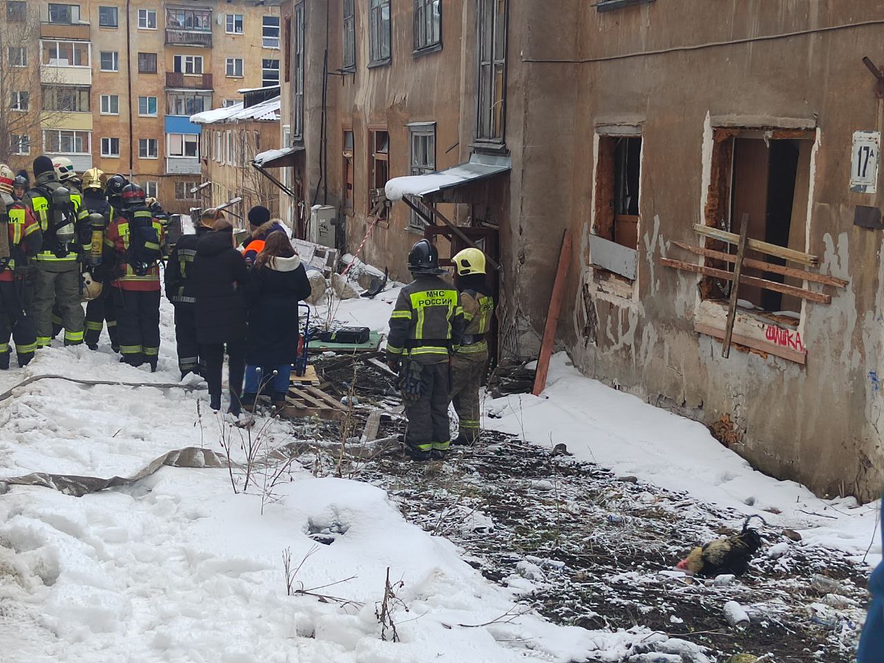 В то время, как петух искал что-то в земле из еды, сотрудники МЧС проводили рядом с бараками учения. Как пояснила очевидица, петуху было все равно. Но птица может погибнуть на холоде.