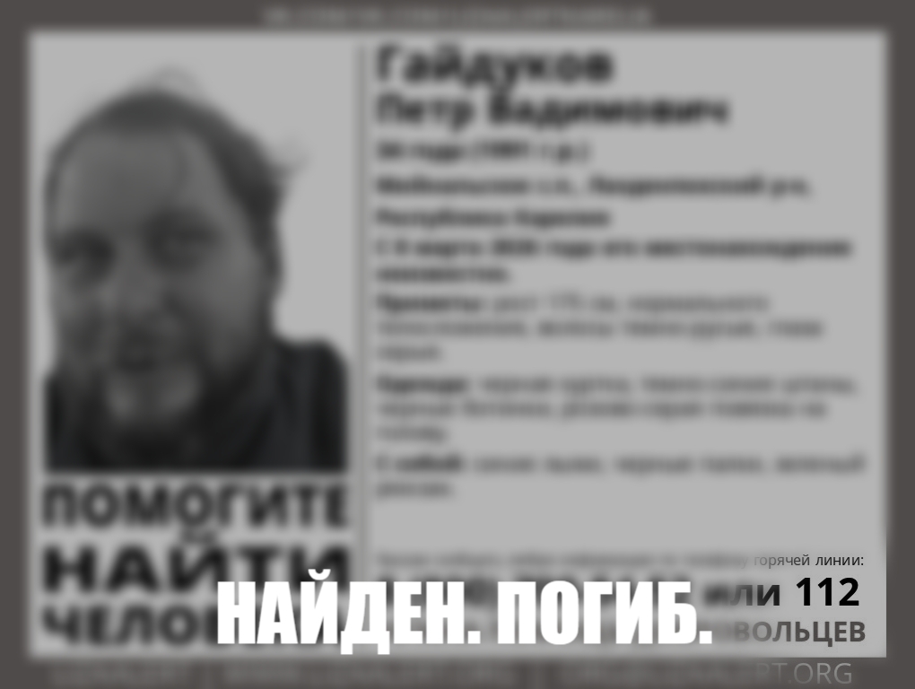 Поисковый отряд «ЛизаАлерт» сообщил трагическую новость. Петр Вадимович Гайдуков, 34-летний житель Мийнальского сельского поселения Лахденпохского района, пропавший 8 марта 2026 года, найден погибшим.