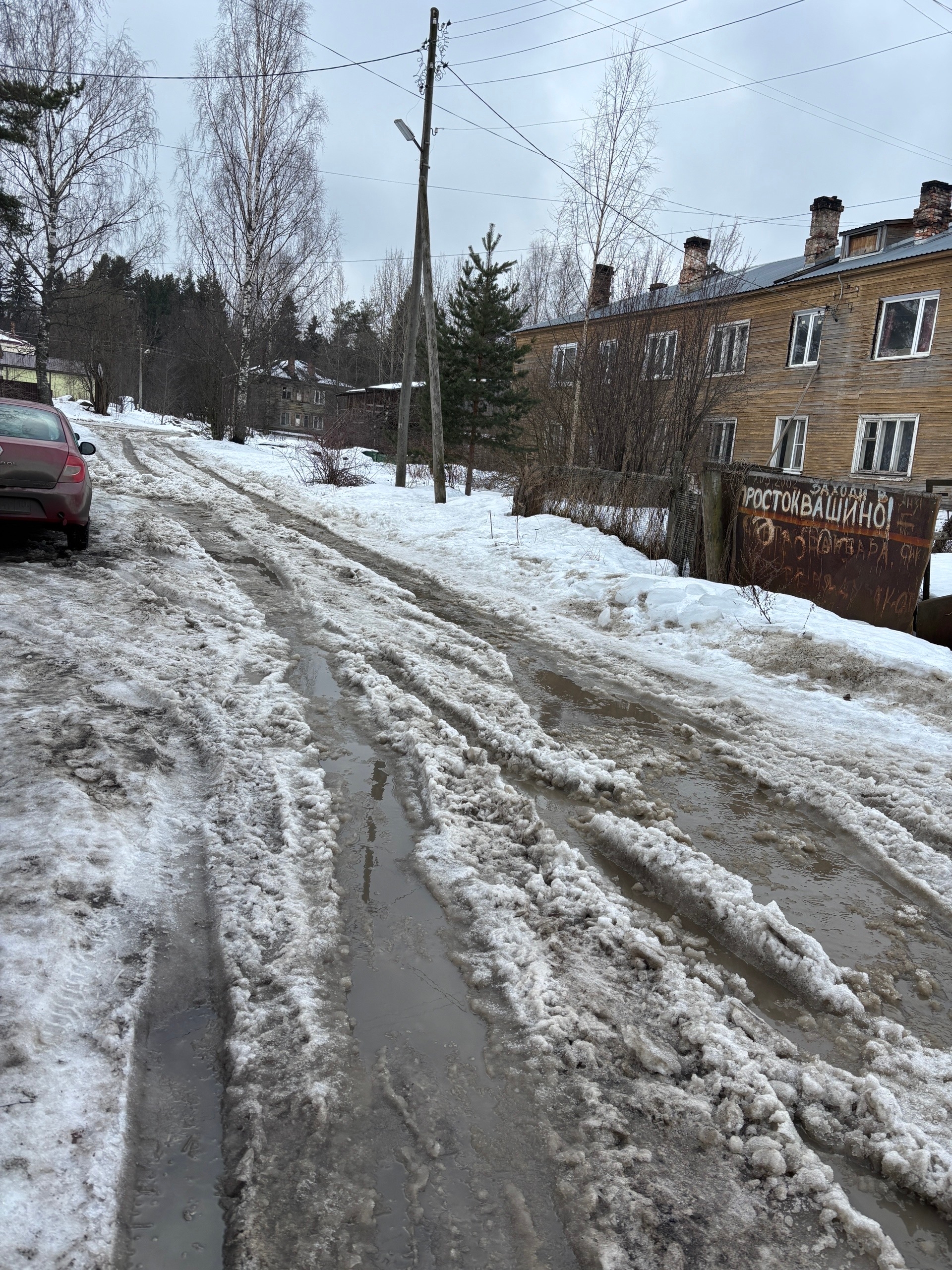 «Муезерская, 57. А точнее Ребольский переулок, не почищена дорога, снег растаял, нам — жителям дома, невозможно даже подъехать и припарковаться…На нашей машине оторвало снизу передний бампер, так как машина просто застряла в этой «каше»…», — рассказали местные жители.
