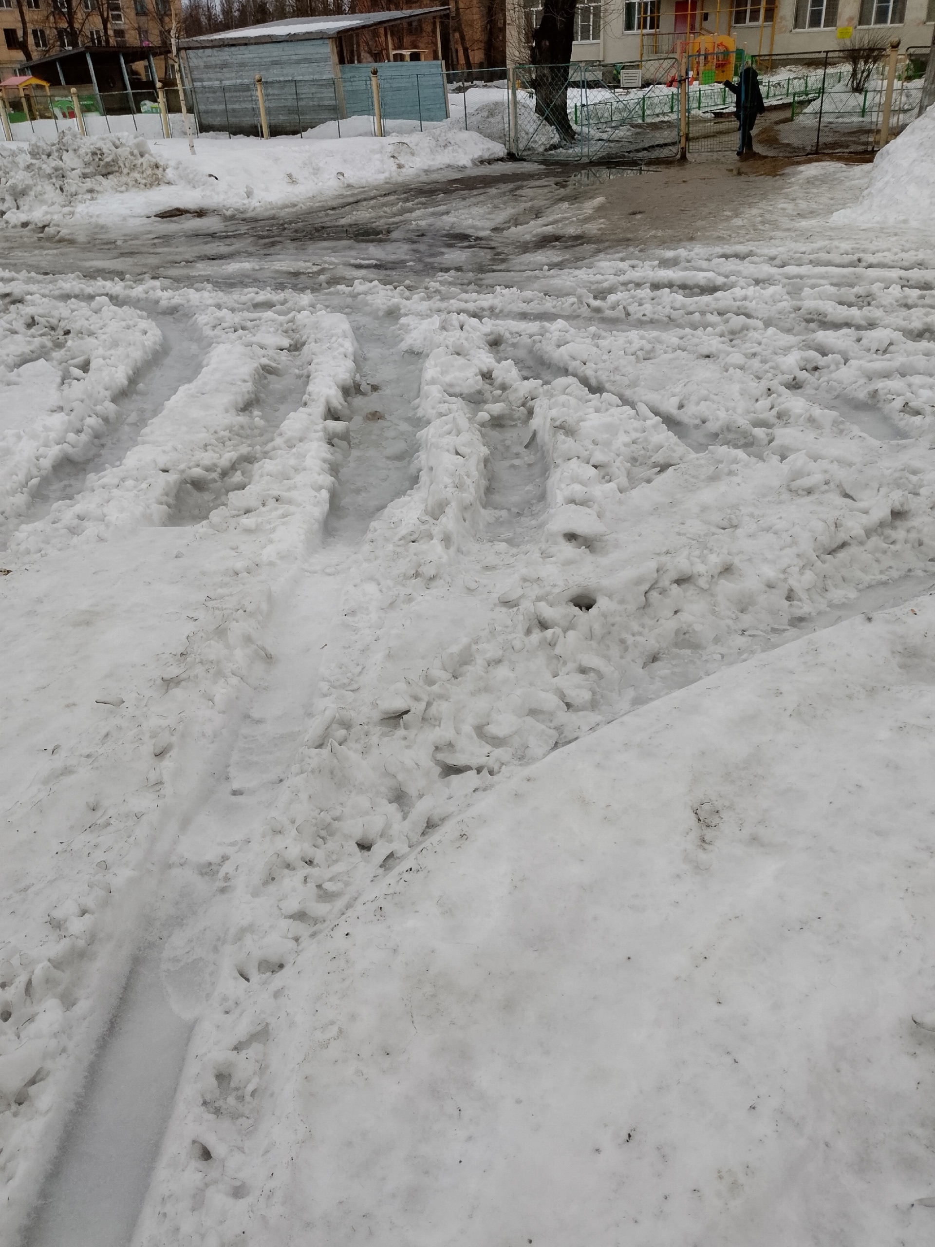 Автор напоминает: на таком участке легко упасть и получить травму. Работники сада помочь не могут — это не их зона ответственности. Вопрос к администрации и подрядчикам, которые занимаются уборкой.