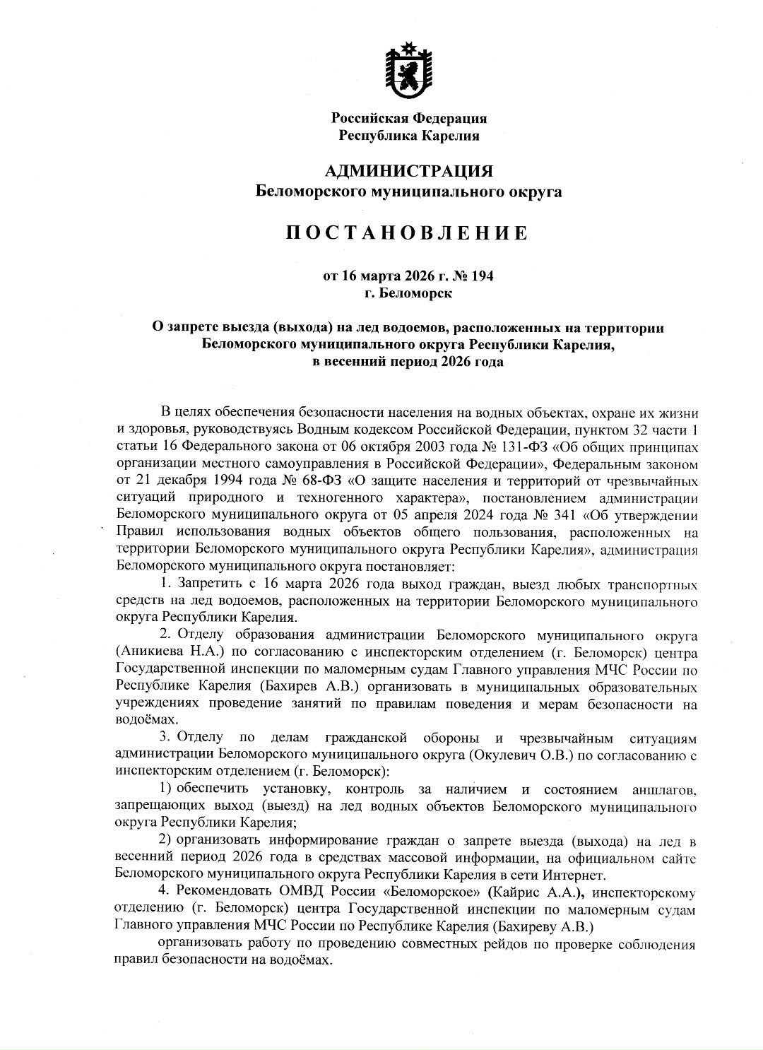 Администрация Беломорского округа приняла постановление от 16 марта 2026 года № 194, согласно которому вводится запрет на выезд и выход на лед водоемов, расположенных на территории округа, в весенний период 2026 года. Об этом сообщило издание «Беломорская трибуна».