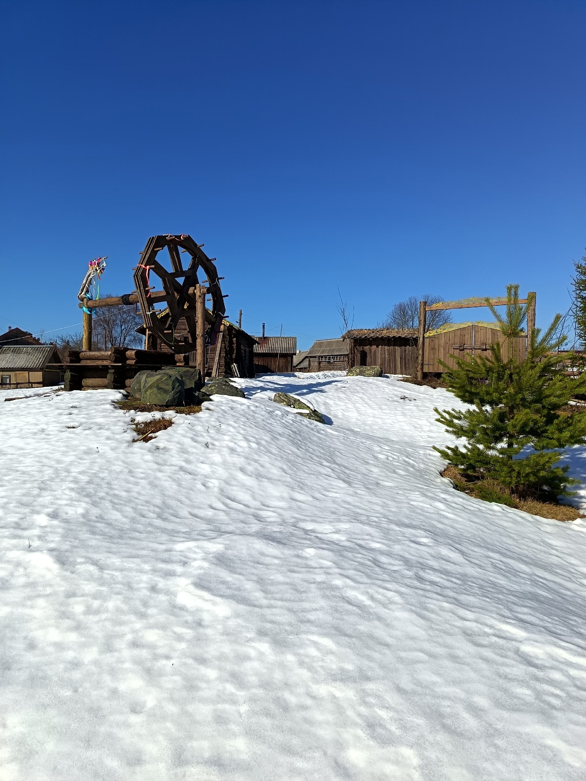 На месте съемок сохранились декорации: бревенчатые избы с резными наличниками и улочки, которые построили художники-постановщики. Местная жительница Юлия провела экскурсию по съемочной площадке и рассказала о процессе создания фильма.