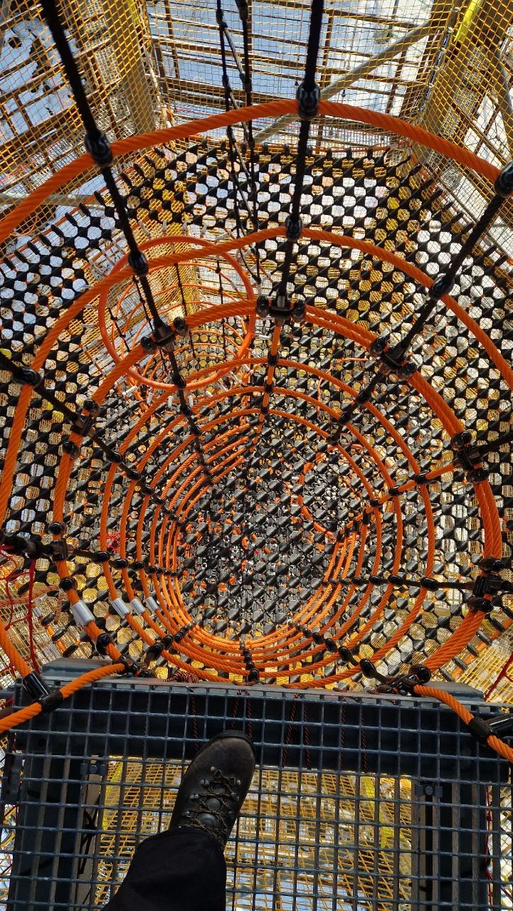 Этот элемент представляет собой спуск по сетчатым полкам и туннелям из крупноячеистых сетей для лазания. Спуск будет осуществляться без снаряжения, страховочную функцию выполнят сети с двойной дублированной защитой.