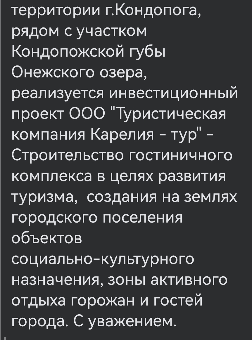 Паблик «Подслушано в Кондопоге» сообщил о начале строительства гостевых туристических домов на набережной Кондопожской губы Онежского озера. Застройщик — компания «Карелия-тур». Горожане возмущены: ранее на этом месте планировали городскую набережную.