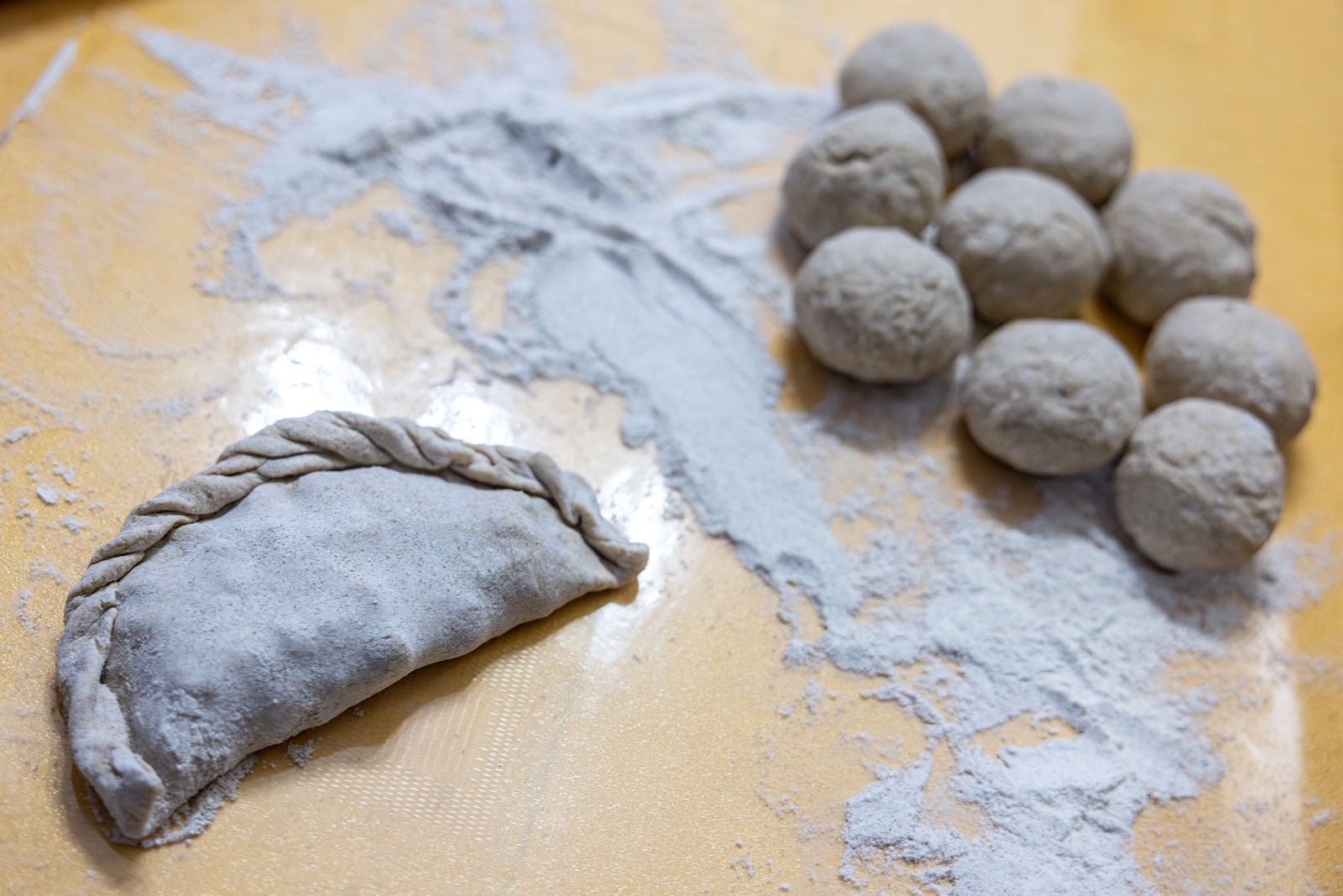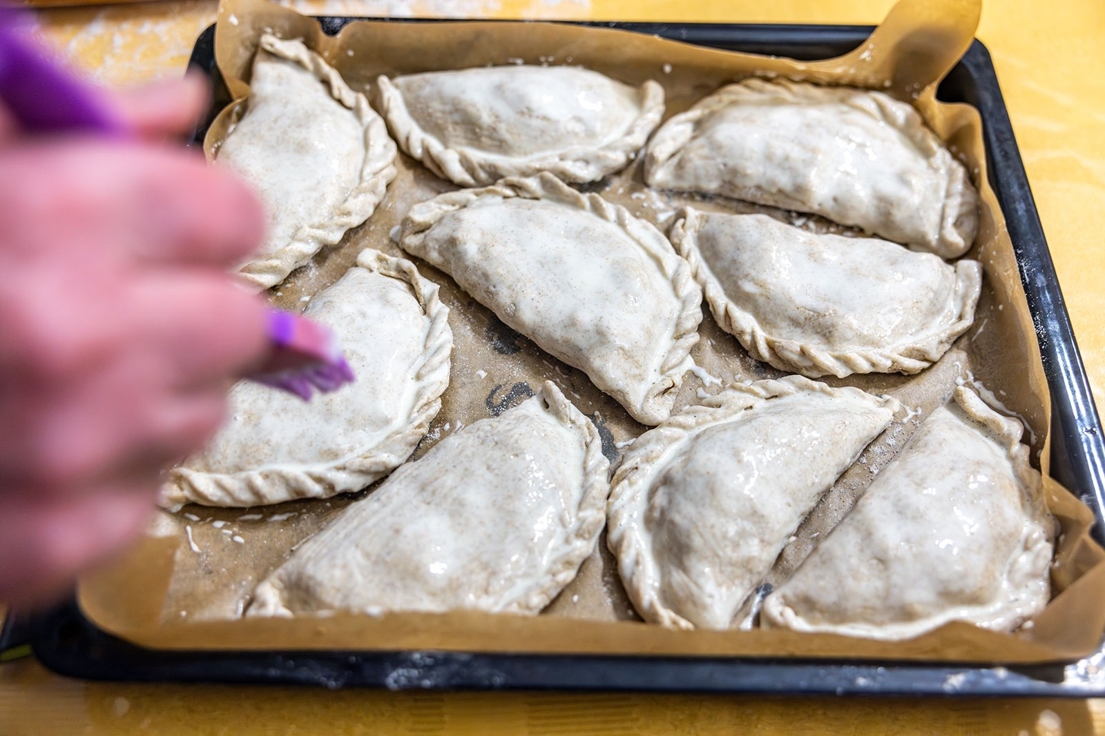 Процесс приготовления начинается с начинки: соленые грузди и волнушки мелко секутся вместе с луком — по-нюхчански это называется «посечь». Второй слой — густая пшенная каша («колоб») со сметаной, которая не должна быть жидкой, чтобы не вытечь. Тесто замешивается из смеси ржаной и пшеничной муки на кефире с молоком, причем пропорции хозяйка определяет «на глазок», пока масса не перестанет липнуть к рукам. Главная фишка блюда — форма: начинка кладется на одну сторону раскатанного круга, вторая накрывает её, создавая косой силуэт, который скрепляется фирменным защипом в виде «крученой веревочки». Перед выпечкой пироги смазываются смесью яйца и сметаны, томятся в духовке 20 минут при 200 градусах, а готовые подрумяненные изделия поливаются водой или крепким чаем для мягкости.