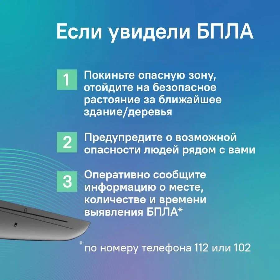 «Уважаемые земляки, прошу сохранять спокойствие и сообщать по номеру 112 обо всех подозрительных ситуациях. В карточках – краткая информация о том, что делать, если вы обнаружили БПЛА», прдчеркнул руководитель региона.