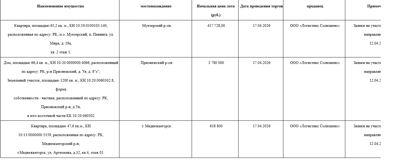Среди имущества представлена недвижимость в Муезерском, Прионежском районах и Медвежьегорске: квартира за 417 тысяч рублей, дом за 3,7 млн рублей, а также квартира в Медвежьегорске за 618 тысяч рублей.