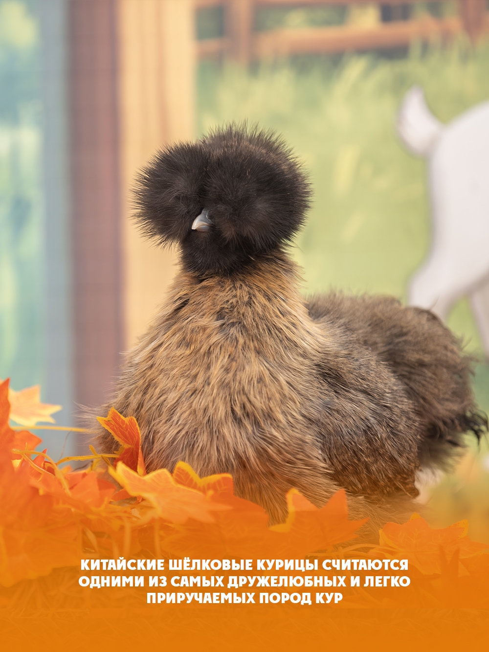 Родом шелковые куры из Восточной Азии. Они напоминают пушистых зверьков из-за мягкого оперения, которое похоже на шерсть. Лапки кажутся бархатистыми. Кроме того, они имеют необычайно черную кожу из-за высокого содержания меланина. Теперь эти экзотические птицы живут в Карельском зоопарке.