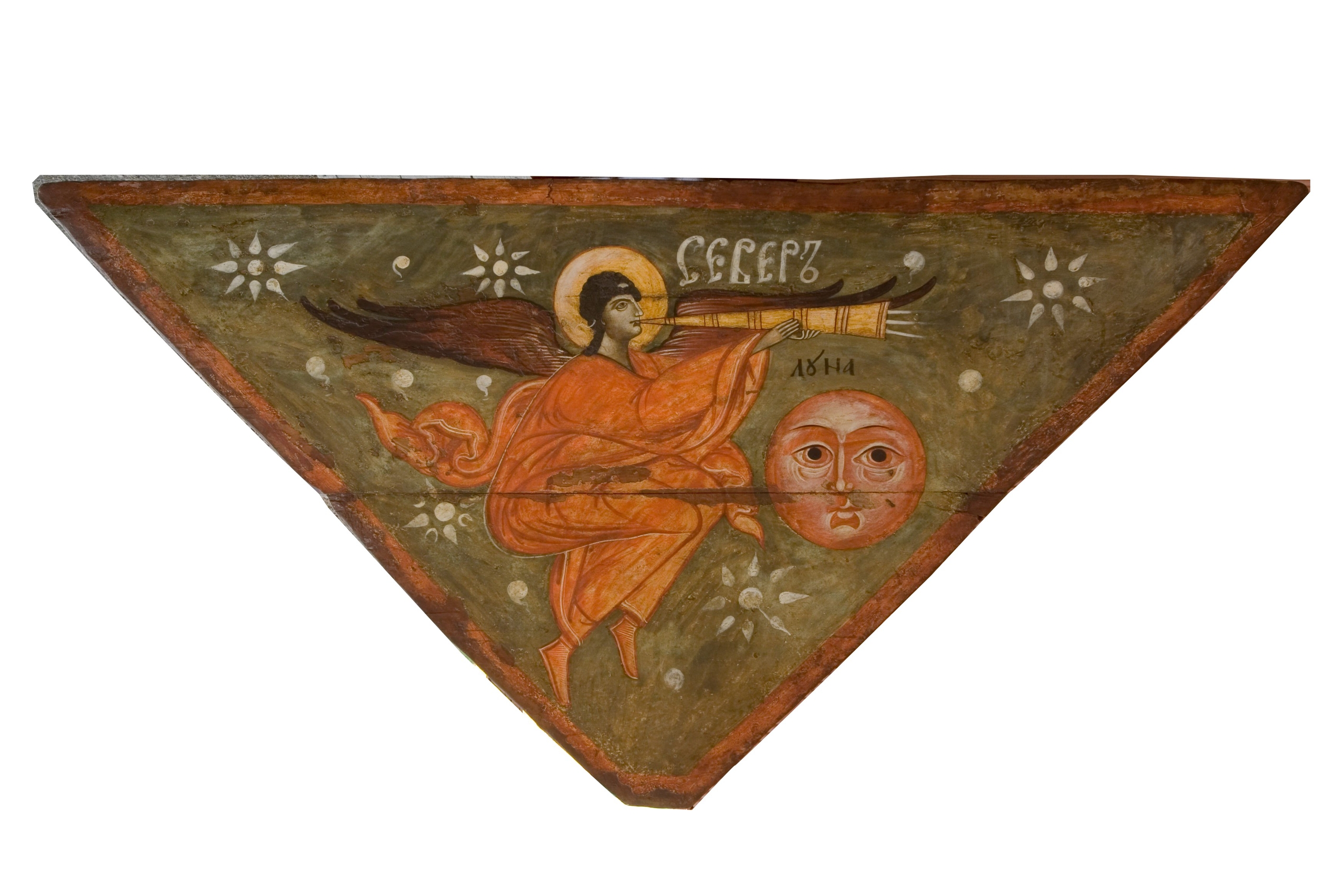 Иконы «неба» Успенской часовни из деревни Васильево на острове Кижи (рубеж XVII–XVIII веков). На них трубящие ангелы парят рядом с антропоморфными небесными светилами. Ангелы сидят в профиль, за спинами — по два развернутых крыла. Одеты в оранжевые хитоны (гиматии), причудливо развевающиеся. На одной иконе слева от ангела — лик Солнца, на другой справа от ангела — лик Луны. По фону разбросаны белые цветы и кружочки с «хвостиками», символизирующие звезды.