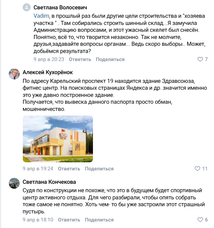 Горожане отмечают, что конструкцию то собирали, то разбирали. Теперь она вновь стоит возвещенная. По словам местных жителей, после того, как в этом месте вырубили лес, постоянно дуют ветры. В паспорте объекта обозначено, что тут должен появится «Спортивный центр активного отдыха». Застройщик — ИП Шмаеник А. А, а генподрядчик — ООО «Стройконтроль». В комментариях под постом пользователи соцсети выдвинули разные версии того, что происходит. В одном все сходятся — пустырь уродует Кукковку.