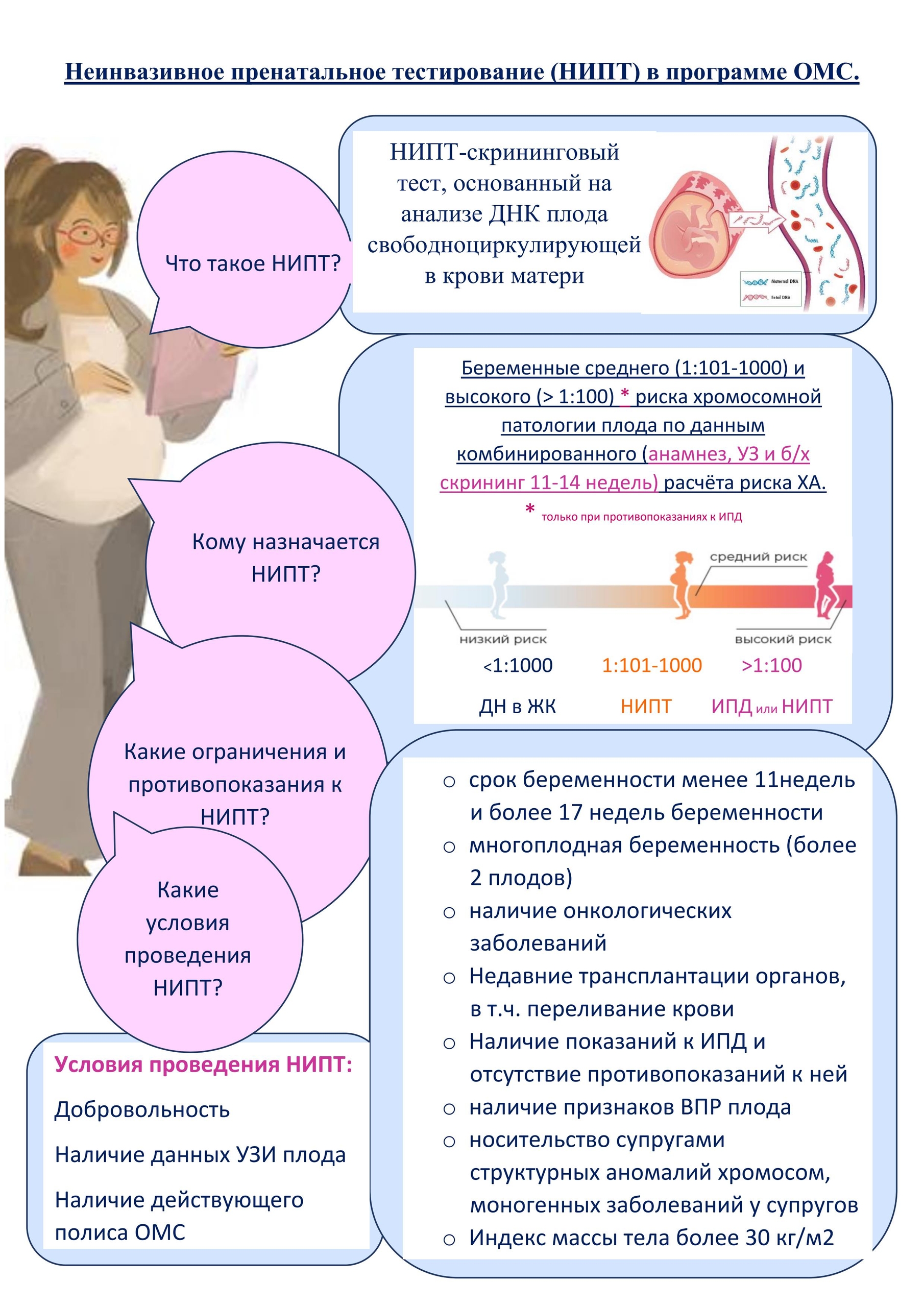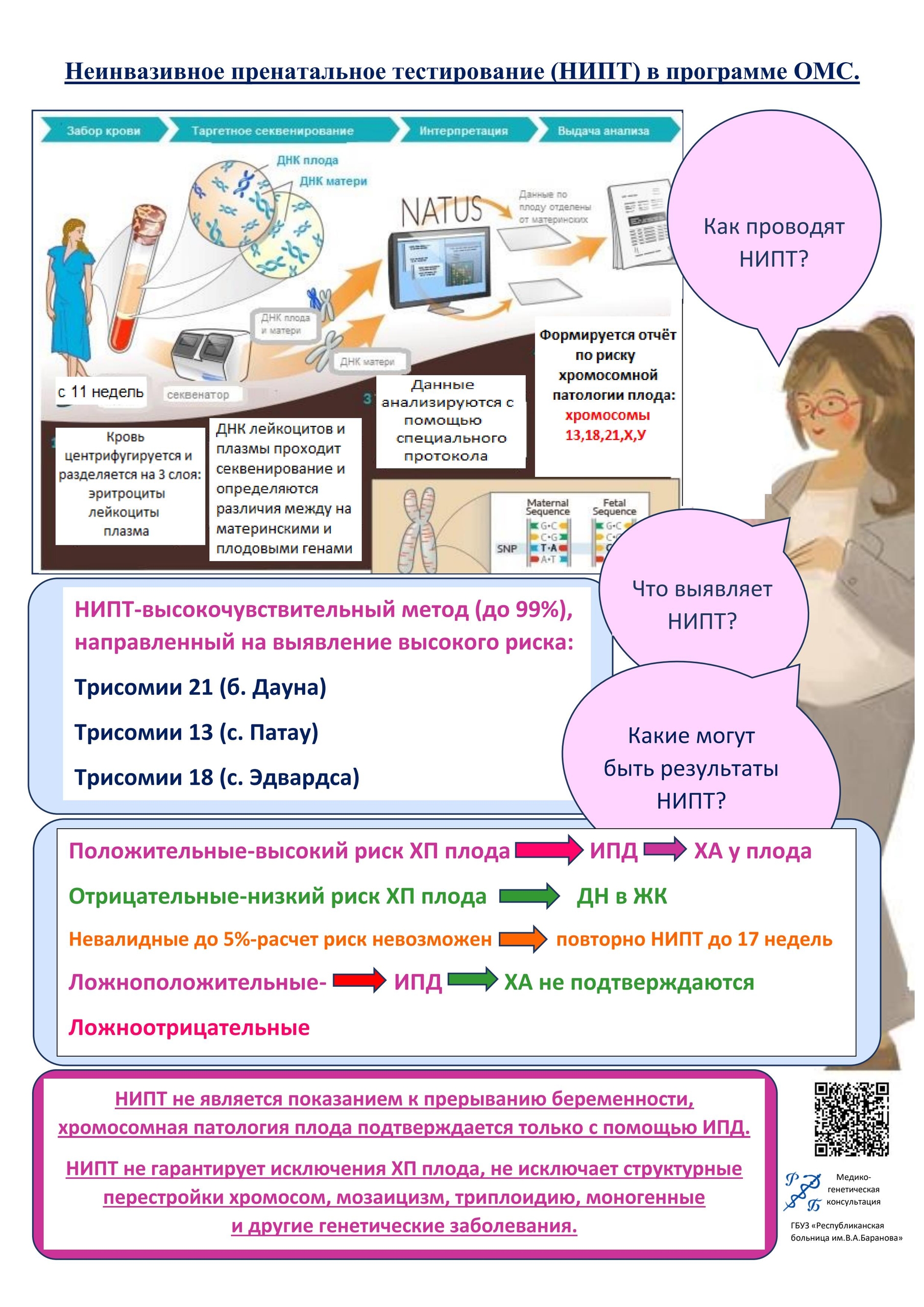 Республиканская больница имени Баранова сообщила, что беременные женщины Карелии могут бесплатно пройти неинвазивное пренатальное тестирование (НИПТ) по ОМС. Этот скрининговый метод выявляет риск хромосомных аномалий у плода (по хромосомам 21, 13, 18). НИПТ основан на исследовании ДНК плода, которая поступает в кровь матери. Процедура безопасна: для анализа нужен обычный забор крови из вены.