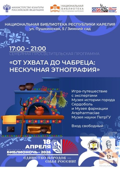 18 апреля 2026 года Национальная библиотека Карелии присоединится к общероссийской акции «Библионочь-2026» – одному из самых ярких культурных событий года. (6+)