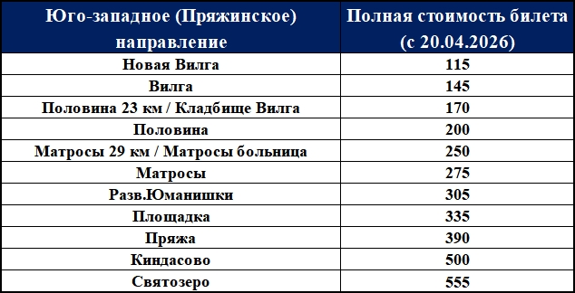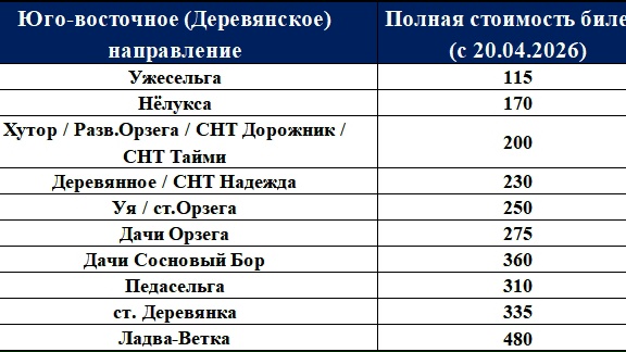 Так, в юго-восточном-направлении до Орзеги стоимость проезда составит 200 рублей, до станции Деревянка -335 рублей. В западном направлении до Падозера — 300 рублей. По юго-западному направлению до деревни Киндасово проезд составит 500 рублей. до Новой Вилги — 115 рублей, до Вилги — 145 рублей, до Матросов — 250 рублей. В южном направлении до Чогозера — 250 рублей, Шапшозера — 275 рублей, билет в Лососинное будет стоить 85 рублей.