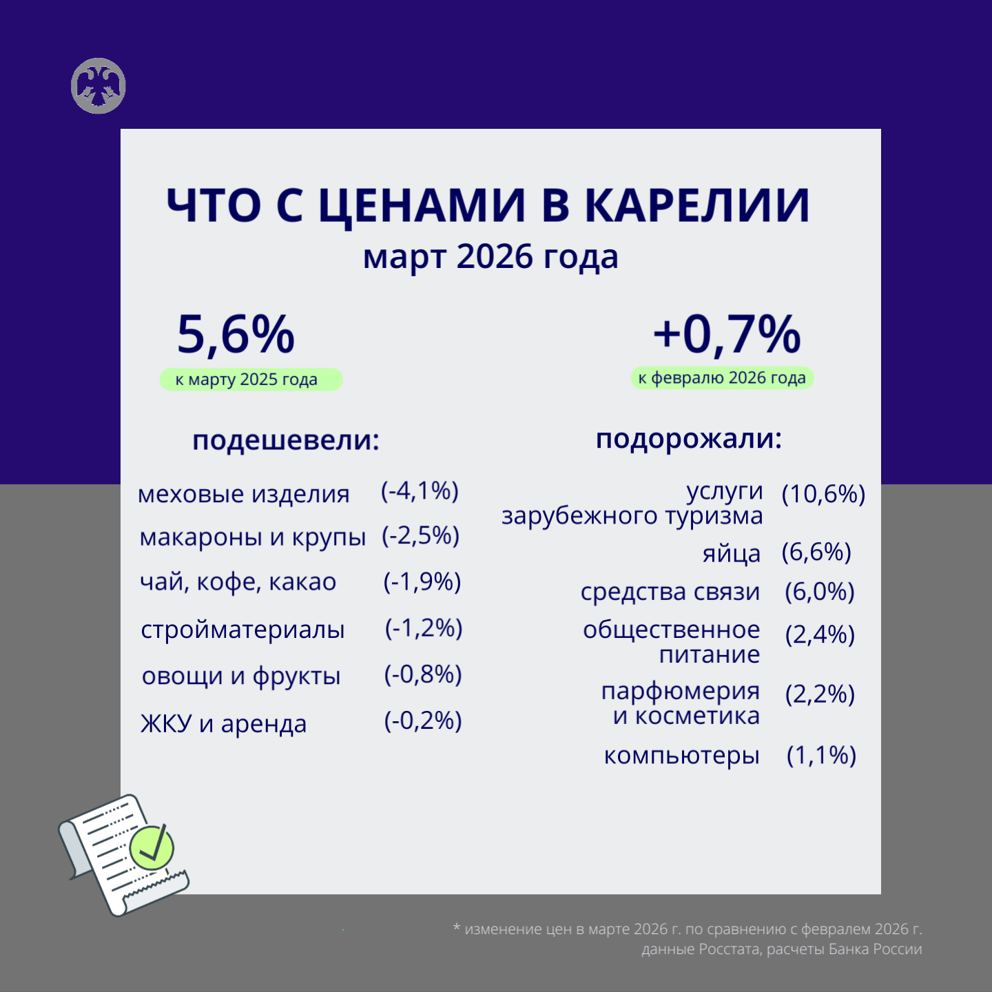 Цены в Карелии в марте 2026 года выросли на 0,72% к февралю этого года. Некоторые товары и услуги дорожали из-за увеличения издержек производителей и поставщиков, а также в связи с ростом спроса. Об этом сообщило карельское отделение Банка России.