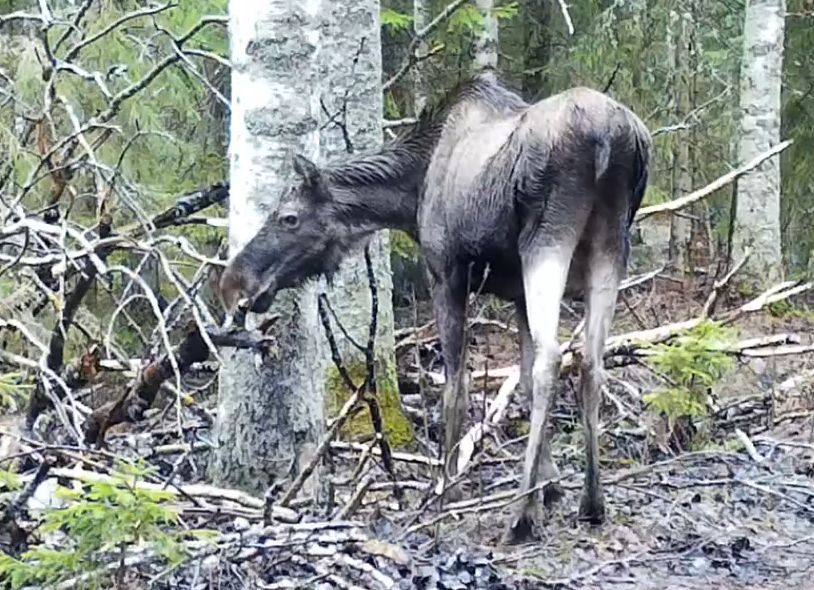 Фотоловушка Нижне-Свирского заповедника зафиксировала неспешную трапезу лесного обитателя. Лось неторопливо лакомился сухими веточками деревьев, тщательно пережевывая немудреную снедь и поглядывал на кору, будто принюхиваясь.