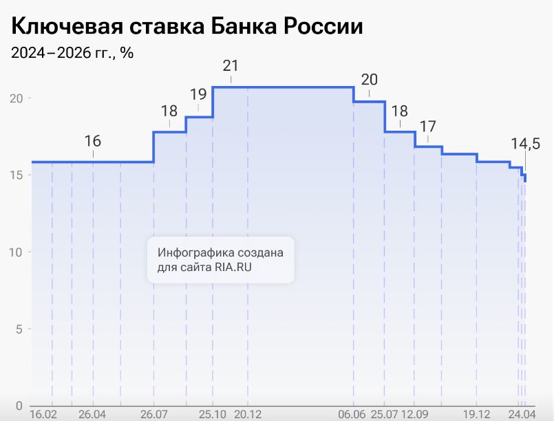 Так, в июне 2025-го впервые за почти три года ее снизили до 20%, затем в июле установили на уровне 18%, в сентябре — 17, в октябре — 16,5, в декабре — 16, в феврале 2026-го — 15,5, в марте — 15. До этого регулятор снижал ее в сентябре 2022 года — до 7,5% В середине 2023-го Банк России начал повышение из-за разогнавшейся инфляции и быстрого роста кредитования. В июле 2024 года ставку подняли на два процента — до 18. В сентябре того же года к ней добавили еще процент, а в октябре повысили на два, до рекордного 21. На историческом максимуме показатель продержался более семи месяцев.